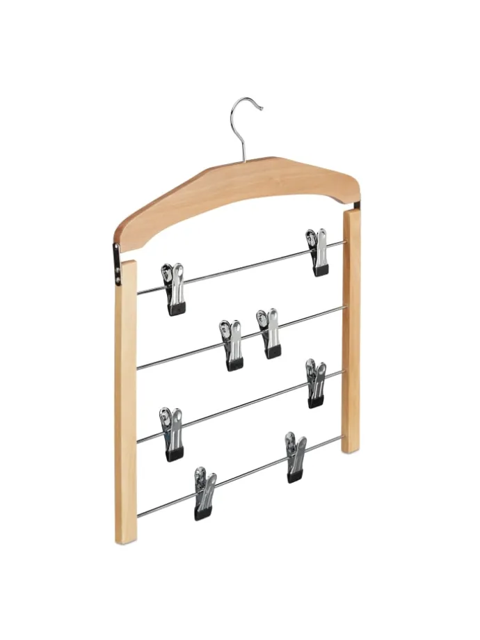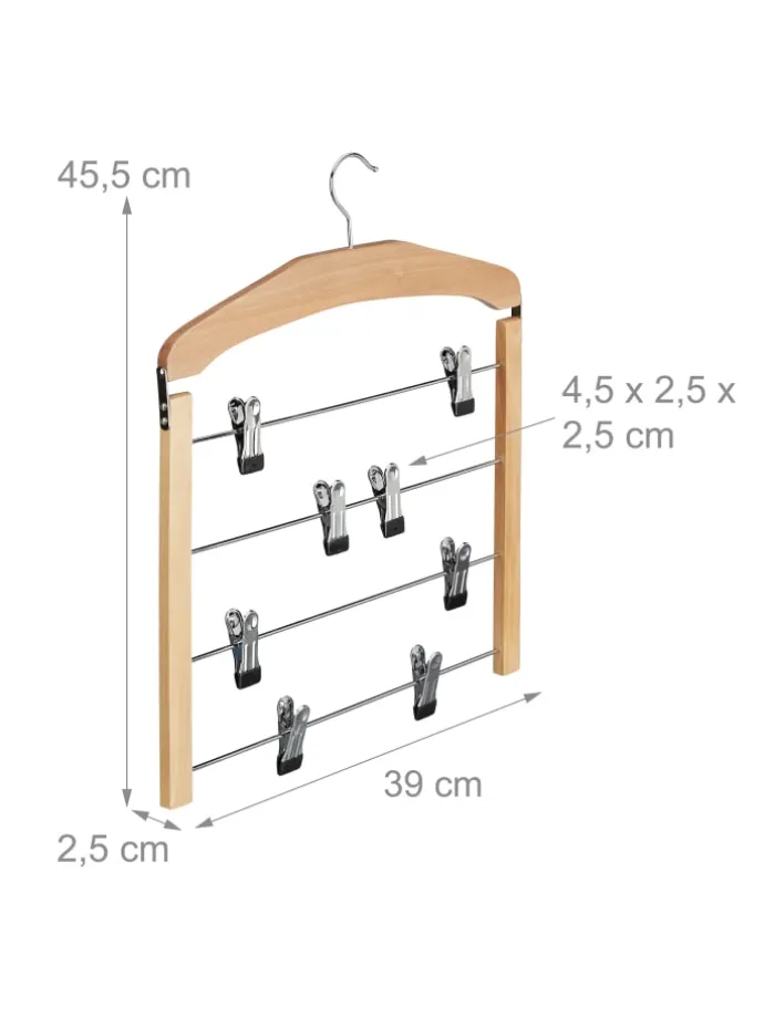Sie haben nicht viel Platz in Ihrem Kleiderschrank, besitzen aber einige Röcke und Hosen, die ordentlich aufbewahrt werden sollen? Dann ist dieser vielseitige Kleiderbügel ideal. Er verfügt über 4 Stangen mit jeweils 2 Metallklammern, die sich nach Bedarf verschieben oder drehen lassen. Die hochwertig verarbeiteten Clips greifen sehr fest zu und sind zudem gummiert, sodass Sie keinerlei Abdrücke auf Ihren Sachen hinterlassen. Dank des Rockbügels bewahren Sie Ihre Kleidungsstücke unkompliziert und knitterfrei auf.