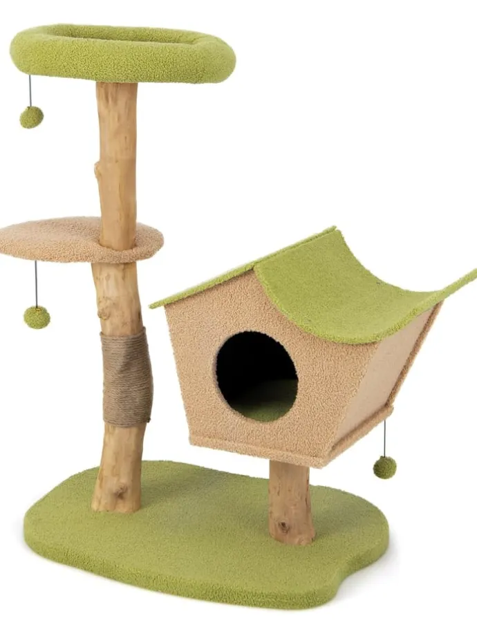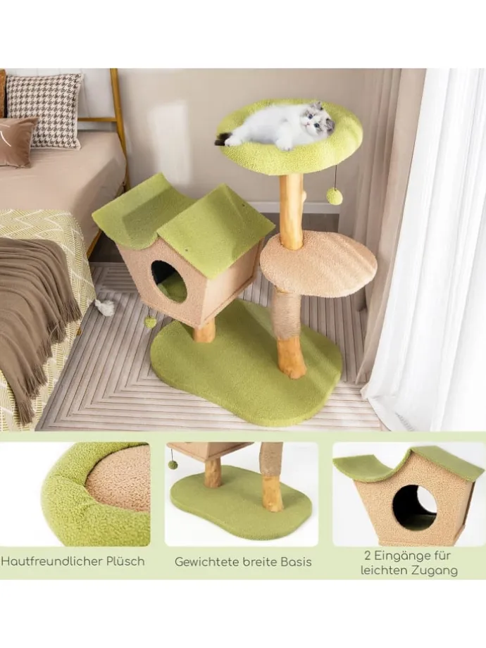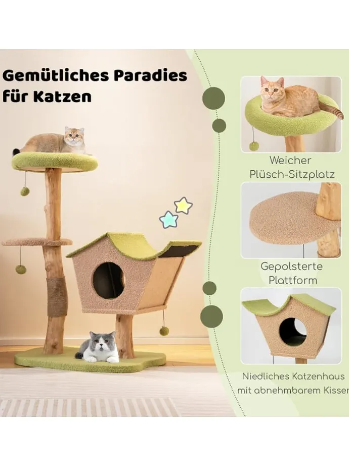 Der Kratzbaum verfügt über einen weichen Sitz oben und eine breite Plattform und bietet so viel Platz für Katzen, um die Landschaft im Freien zu genießen, zu springen und zu erkunden. Dank hautfreundlichem Plüsch können Ihre Kätzchen bequem auf dem Kratzbaum liegen. Darüber hinaus sollen die mit Jute umwickelten Pfosten und die 3 baumelnden Bälle Katzen dabei helfen, gesunde Krallen zu erhalten und ihren Instinkten freien Lauf zu lassen, was den Kletterbaum zu einem perfekten Spielplatz für Katzen macht. Und das schöne Häuschen verfügt über ein abnehmbares Kissen, das Katzen einen gemütlichen und geräumigen Schlafplatz bietet. Im Gegensatz zu zerbrechlichem Holzwerkstoff, dem es an Stil mangelt und der leicht reißt, bestehen unsere Produkte aus natürlichem Birnbaumholz.