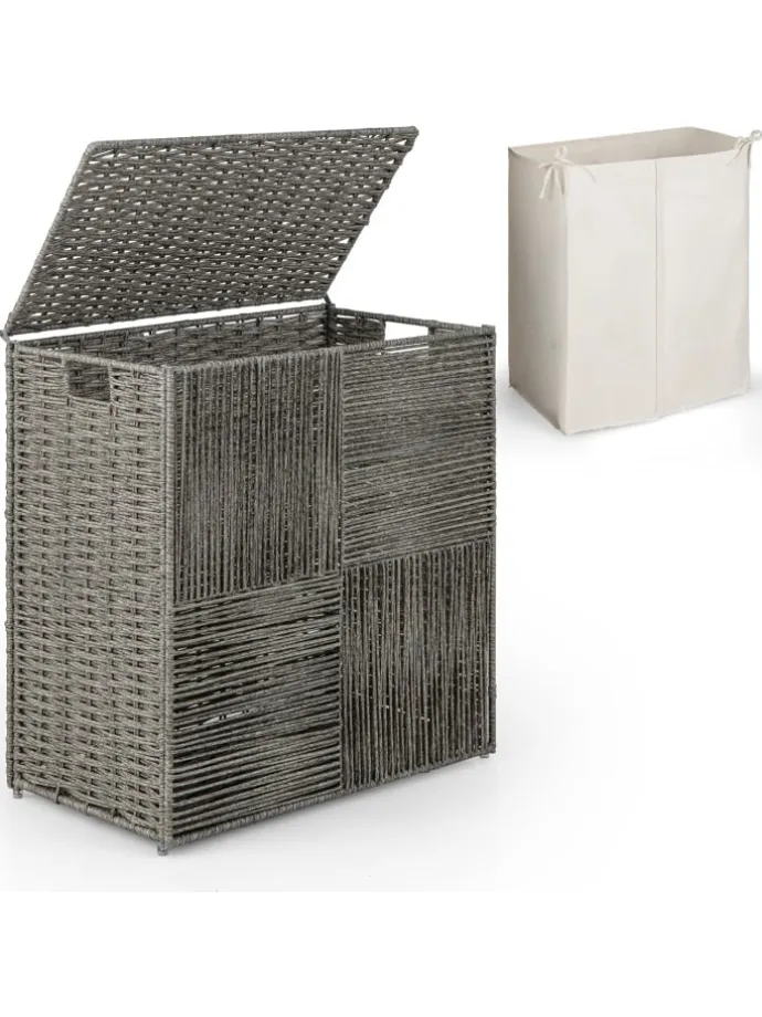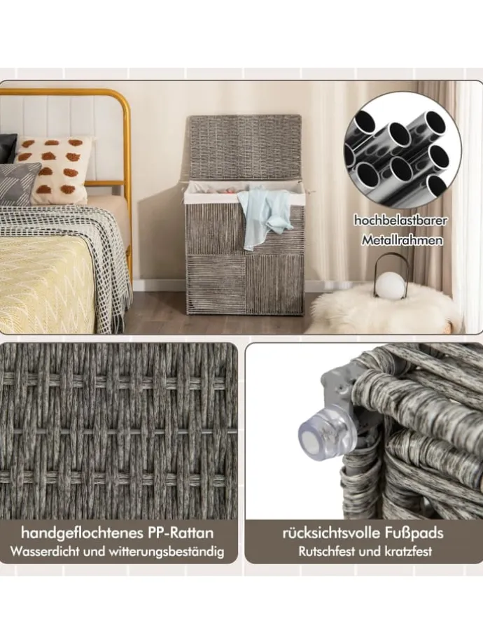 Dieser Wäschekorb aus hochwertigem PP-Rattan mit hoher Haltbarkeit verspricht eine lang anhaltende Nutzung. Der robuste Metallrahmen sorgt für Stabilität und trägt bis zu 45 kg. Darüber hinaus halten die erhöhten Fußpolster den Wäschekorb vom Boden fern. Mit separaten Bereichen im Innenfutterbeutel können Sie Ihre Kleidung klassifizieren. Der Innenfutterbeutel kann herausgezogen und bei Bedarf maschinengewaschen werden. Wenn Sie diesen Wäschekorb bewegen müssen, bieten die praktischen Griffe Bequemlichkeit. Bei Nichtgebrauch kann er einfach zusammengeklappt und verstaut werden.
