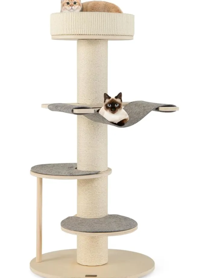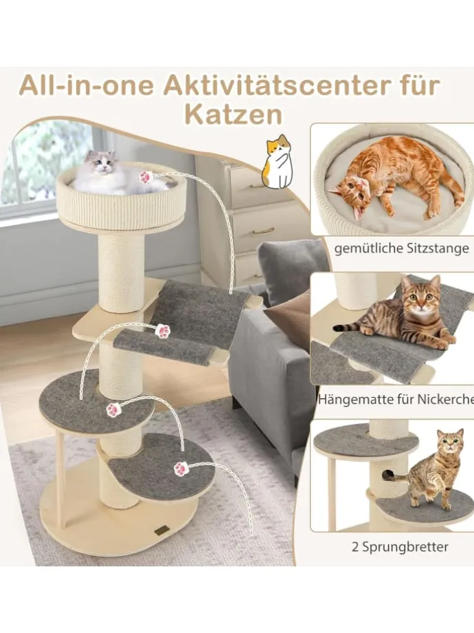 Das All-in-One-Katzenaktivitätszentrum verfügt über einen weichen Sitz mit Sisalteppich. So können Katzen nicht nur erholsam schlafen, sondern auch ihre Krallen schärfen. Außerdem sind die 14,5 cm dicken Sisalstämme robust und kratzfest, was eine perfekte Lösung zum Schutz Ihrer Möbel darstellt. Mit 2 gepolsterten Sprungplattformen können Katzen problemlos auf und ab springen. Und die abnehmbare Hängematte bietet Katzen einen weiteren Platz zum Ausruhen. Sowohl die Hängematte als auch die rutschfesten Pads bestehen aus reißfestem Vliesstoff und sorgen für ein atmungsaktives Erlebnis. Der 4-stöckige Katzenturm verfügt über eine breite Basis und 6 rutschfeste Pads für überragende Stabilität.