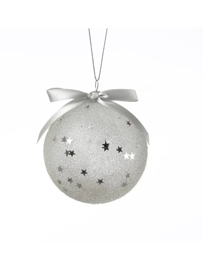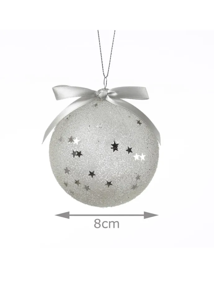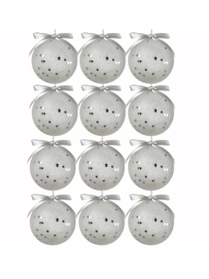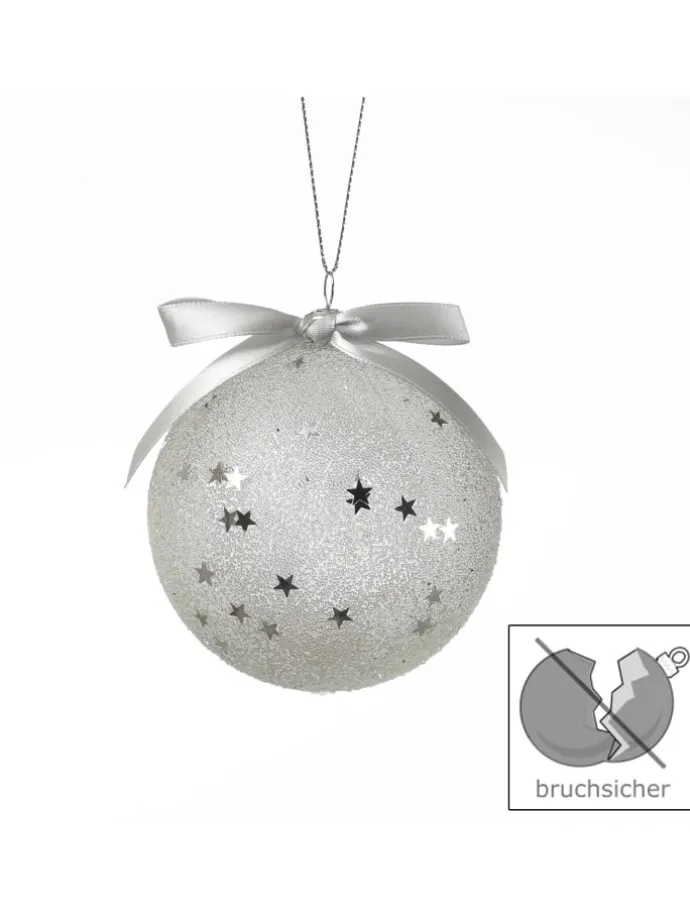 Bringe modernen Glanz in dein Zuhause mit diesem 12er-Set stilvoller Christbaumkugeln aus bruchfestem Kunststoff. Die halb-transparenten Kugeln funkeln dezent durch feinen Glitzer und zaubern zusammen mit den silbernen Sternchen eine elegante, festliche Atmosphäre. Der silberne Aufhänger mit weißer Schleife rundet das edle Design perfekt ab und verleiht deinem Weihnachtsbaum einen modernen Touch.