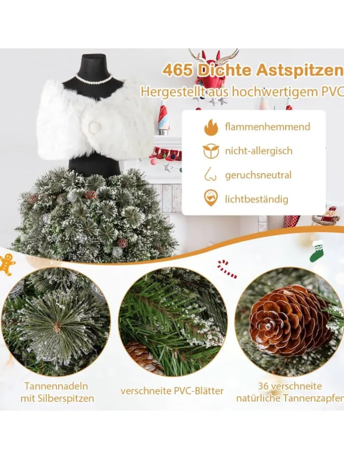 Der künstliche Weihnachtsbaum ist in Form einer Schneiderpuppe mit 465 üppigen Zweigspitzen gestaltet und sieht unverwechselbar aus. Mit silberfarbenen Tannennadeln, schneeweißen PVC-Blättern und 36 natürlichen Tannenzapfen schafft die aufklappbare Schneiderpuppe eine zusätzliche winterliche Atmosphäre. Ihre Zweigspitzen bestehen aus feuerfestem PVC für ein sicheres Erlebnis. Darüber hinaus sorgt die Schneiderpuppe mit einem wunderschönen weißen Schal, einer Perlenbrosche und einer Halskette für ein luxuriöses Erscheinungsbild, was den Weihnachtsbaum zur perfekten Wahl macht, um unseren festlichen Dekorationen eine stilvolle Note zu verleihen.