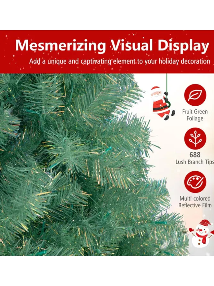 Unser 180 cm hoher vorbeleuchteter künstlicher Weihnachtsbaum ist ein Highlight, das Tradition und modernen Glanz in Ihre Weihnachtsdekoration bringt. Mit einer dichten Zweiganordnung von 688 Spitzen, die mit mehrfarbigen reflektierenden Folien bedeckt sind, erstrahlt jede Perspektive in Dunkelviolett, Fruchtgrün, Rosa oder Lavendel (4 Farben verfügbar). Beleuchten Sie Ihre Abende mit 250 warmweißen LED-Lichtern und wählen Sie aus 8 Modi, von ruhigem statischem Licht bis zu lebendigen dynamischen Einstellungen, um die perfekte Festtagsatmosphäre zu schaffen. Die stabile Kreuzmetallbasis garantiert einen sicheren Stand während der gesamten Saison.