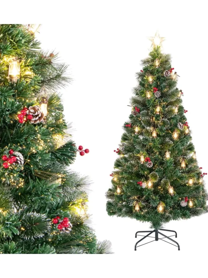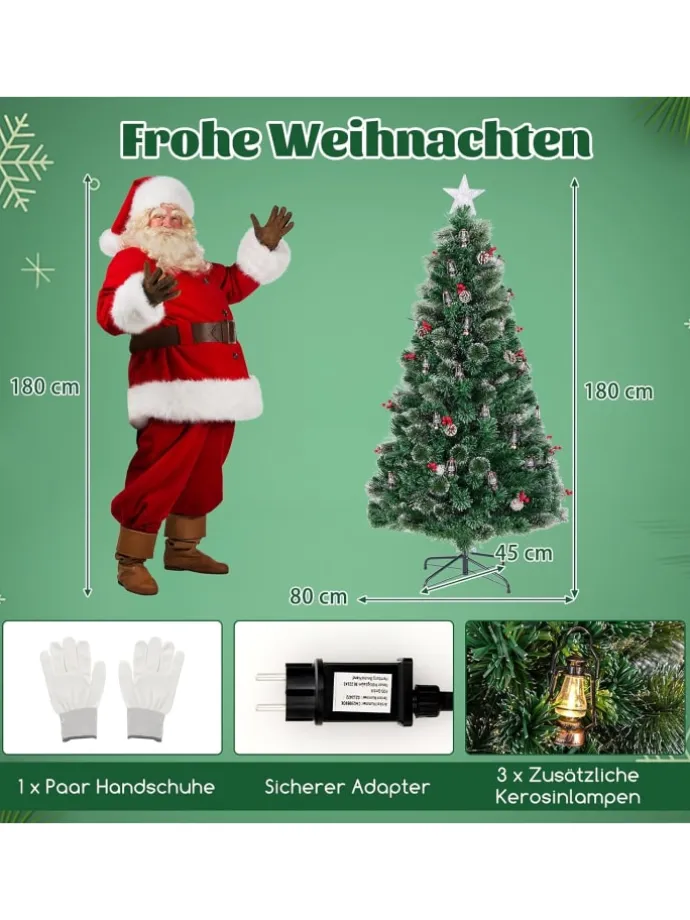 Werten Sie Ihre festliche Dekoration mit einem realistischen 180 cm großen Weihnachtsbaum auf, der mit 220 üppigen Zweigspitzen, schneeweißen Tannennadeln, 20 natürlichen Tannenzapfen und 20 Büscheln roter Beeren geschmückt ist. Dank neuem PVC ist der Dekorationsbaum sicher, geruchsfrei, antiallergisch und feuerfest. Der Weihnachtsbaum wird für Ihre Bequemlichkeit mit Handschuhen und Ersatzpetroleumlampen geliefert. Erleben Sie die Wärme des Winterfests mit diesem eleganten und praktischen Christbaum. Frohe Weihnachten!