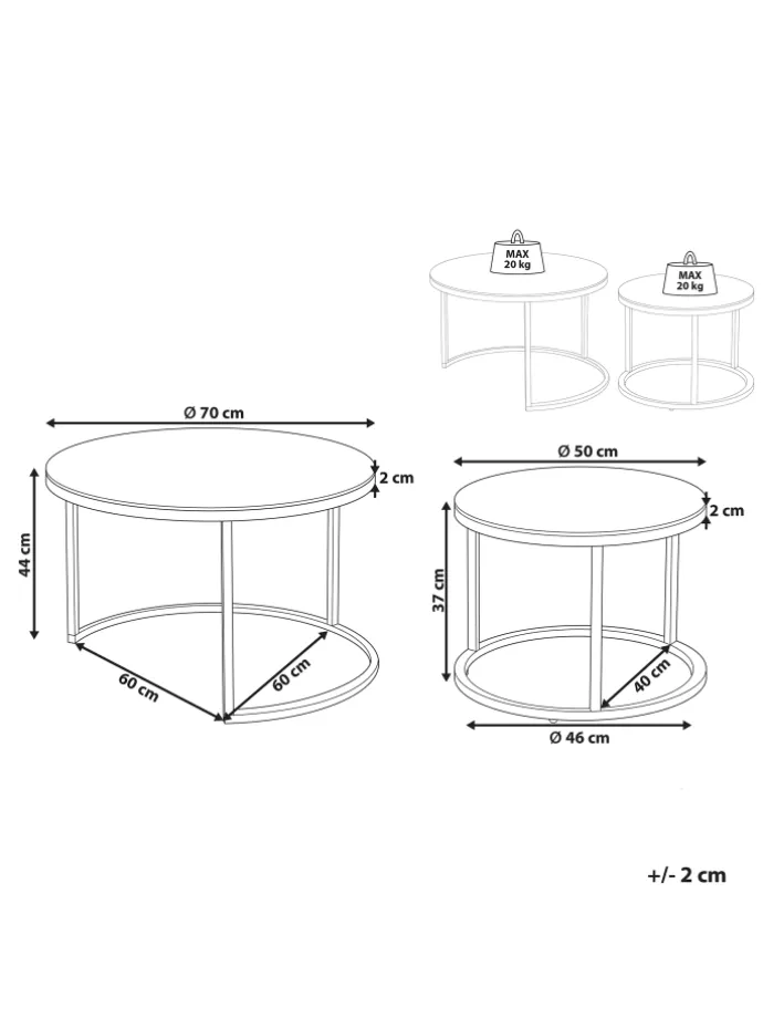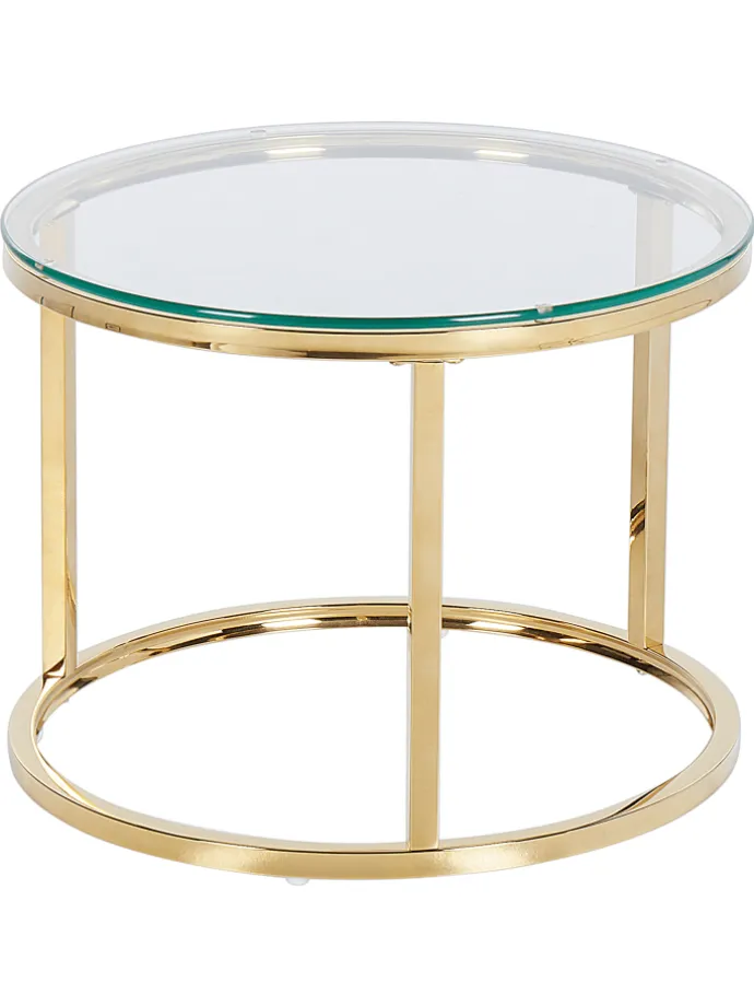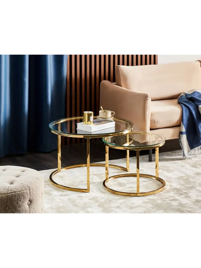Couchtisch-Set im glamourösen Stil. Dieses umwerfende Set von Couchtischen vereint Glamour, Stil und Funktionalität in einem. Der kleinere Tisch lässt sich bei Bedarf ganz einfach unter den größeren schieben. Die runden Tischplatten aus gehärtetem Glas tragen nicht nur zu der eleganten Ästhetik bei, sondern bieten auch Sicherheit. Mit dem offenen Gestell aus goldglänzendem Edelstahl sind diese Tische ideal dafür geeignet, Ihrem Zuhause einen Hauch von Luxus zu verleihen.