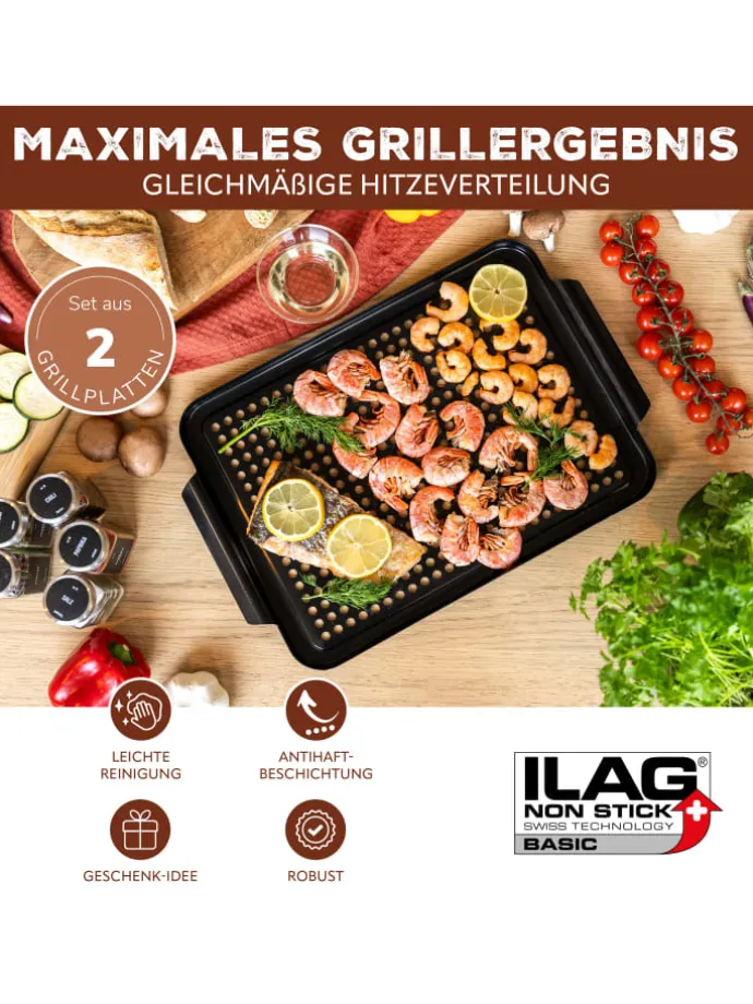 Die stabile Grillplatte ist innen und außen mit ILAG® antihaftbeschichtet für schonendes Grillen ohne Anhaftung und eine leichtere Reinigung per Hand. Auf gängigen Grillgeräten einsetzbar bei Temperaturen bis 220° C.