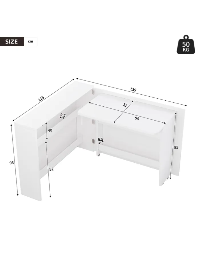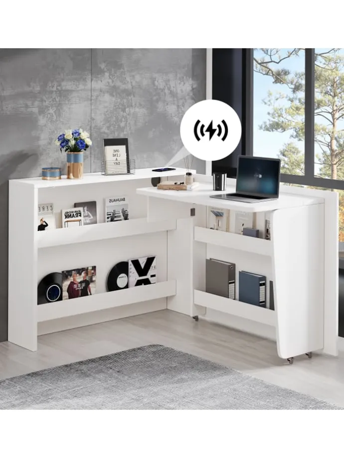 Ein elegantes und multifunktionales Möbelstück für Ihr Zuhause oder Büro! Dieser Schreibtisch im modernen Hochglanz-White-Design verwandelt sich im Handumdrehen von einem platzsparenden Sideboard (115x27x93 cm) in einen vollwertigen Arbeitsplatz mit großzügiger Tischfläche (95×51 cm).