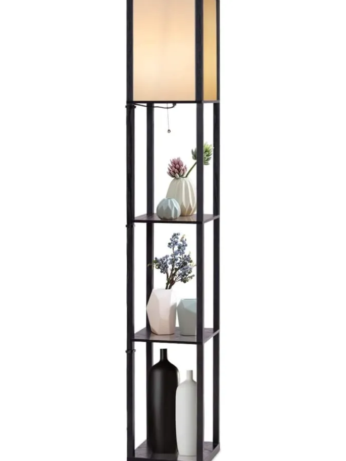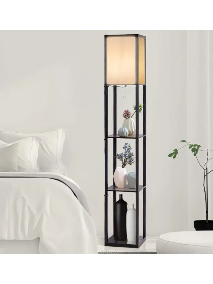 Diese freistehende Stehleuchte zeichnet ein weiches Licht in ihrem Wohnraum. Darüber hinaus bietet die Lampe ein dreistufiges Regal, um ihren Stauraum zu vergrößern. Mit einem weißen Lampenschirm aus Leinen wird das Licht nicht zu hell, und die sanfte Beleuchtung eignet sich hervorragend zum Lesen oder Fernsehen. Eignet sich nach einem Arbeitstag vor allem zum Entspannen. Diese Stehlampe mit Regal besteht aus hochwertigem Spanholz, das langlebig und strapazierfähig ist. Der Rahmen ist stabil und wackelt nicht. Die Kombination aus schwarzen Regalen und weißem Lampenschirm macht unsere Stehleuchte perfekt für Ihr Wohnzimmer, Schlafzimmer oder jeden anderen Raum in ihrem Haus.