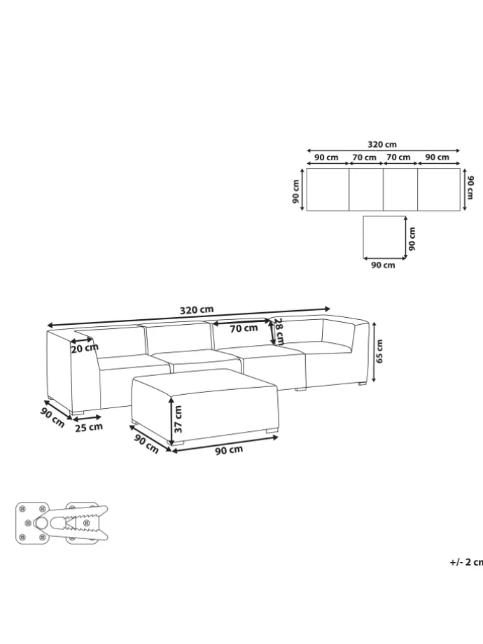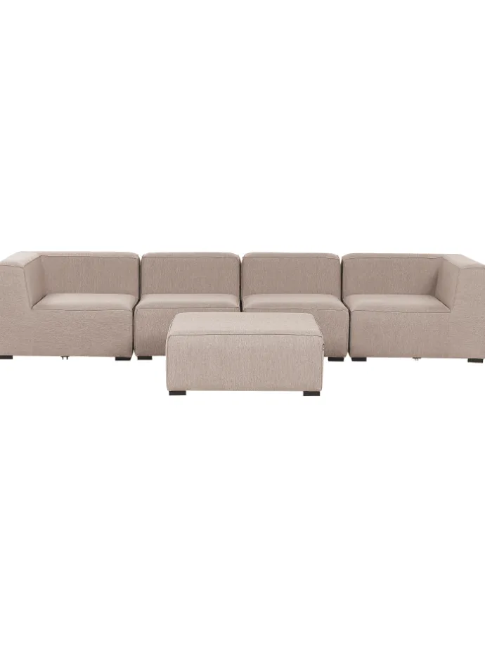 Luxuriöses 4-teiliges Outdoor und Indoor Modulsofa mit passender Ottomane. Ein modernes Design, Komfort und Funktionalität, so lässt sich dieses Gartensofa Set perfekt beschreiben. Sie können alle Sitzelemente jedoch auch alle als alleinstehende Stücke platzieren und so die Aufstellung flexibel, individuell und ganz nach Bedarf an Ihre räumlichen Gegebenheiten anpassen. Das stabile, schwarze Untergetell ist aus pulverbeschichtetem Metall gefertigt. Die Gartenmöbel sind im Inneren mit einem schnelltrocknenden Schaumstoff gepolstert, welcher Wasser dank seiner speziellen Struktur wesentlich schneller durchlaufen lässt als hochelastische Schaumstoffe.
