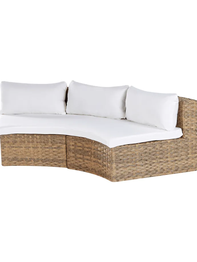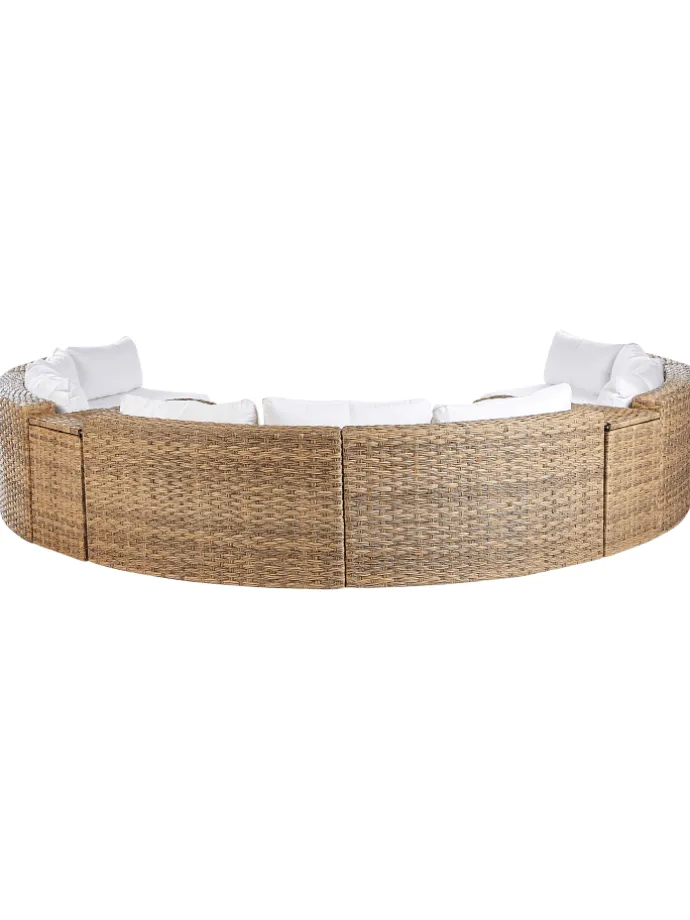 Halbrundes Lounge Set für bis zu 9 Personen. Das exklusive Loungeset ist aus hochwertigem Polyrattan gefertigt und punktet mit Strapazierfähigkeit, Belastbarkeit, extremen Witterungsbeständigkeit und langen Lebensdauer. Die abziehbaren, weißen Bezüge aus hochwertigem Polyester sind dank ihrer schmutz- und feuchtigkeitsabweisenden Beschichtung besonders pflegeleicht. Die praktischen Aufbewahrboxen sind vielseitig nutzbar als Trennelemente zwischen den Sitzelementen, als nützliche Abstellfläche für Ihre Zeitschrift und bieten gleichzeitig viel Stauraum für Kissen oder andere Utensilien. Auf dem runden Loungetisch findet sich selbstverständlich auch noch Platz für Ihre sommerlichen Cocktails.
