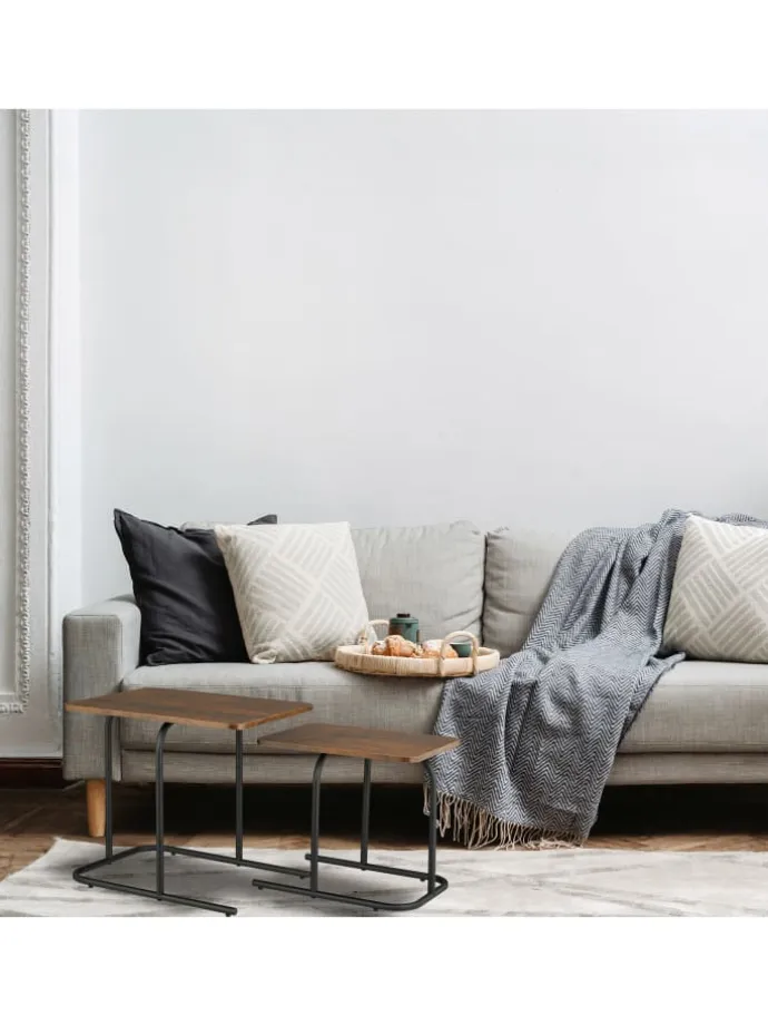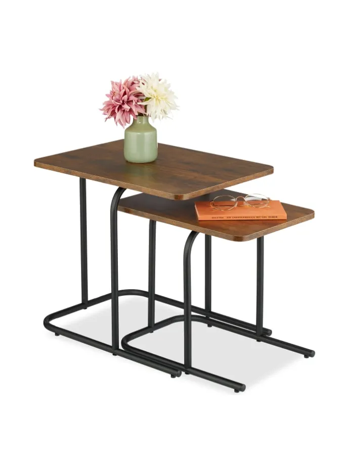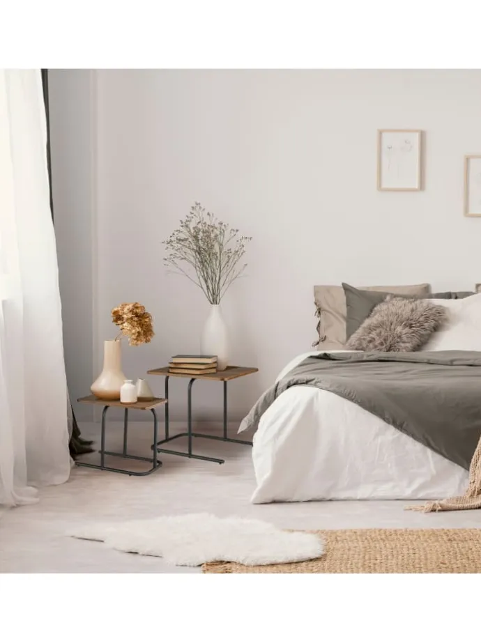 Getränke abstellen, ein Buch ablegen, Blumen anrichten oder Deko in Szene setzen – all das ist auf diesen dekorativen Ablagetischen im 2er Set möglich. Als Couchtische im Wohnzimmer sind sie eine dekorative und nützliche Ergänzung vor dem Sofa. Einzeln neben dem Bett im Schlafzimmer werden sie zum Nachttisch für Wecker und Lampe und im Flur zum praktischen Ablagetisch. Optisch überzeugen die Ziertische mit ihrer dekorativen Holzoptik-Tischplatte in Kombination mit den schwarzen Metallbeinen.