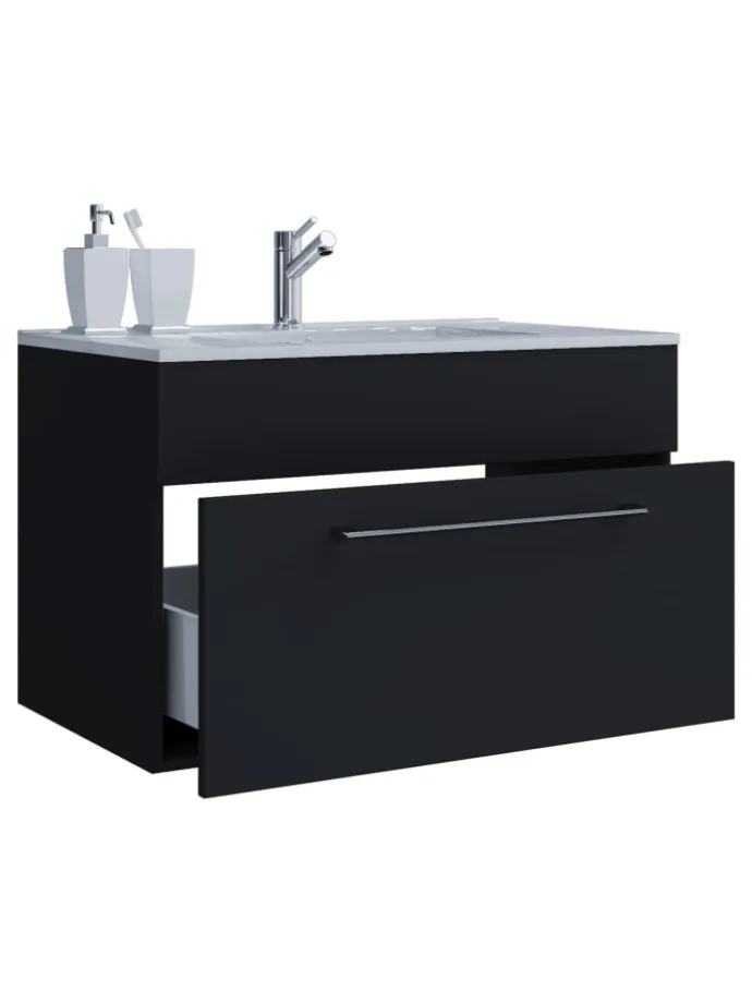 Das Badmöbel-Set besteht aus einem Unterschrank mit einer leichtgängigen Schublade mit Metallauszügen.