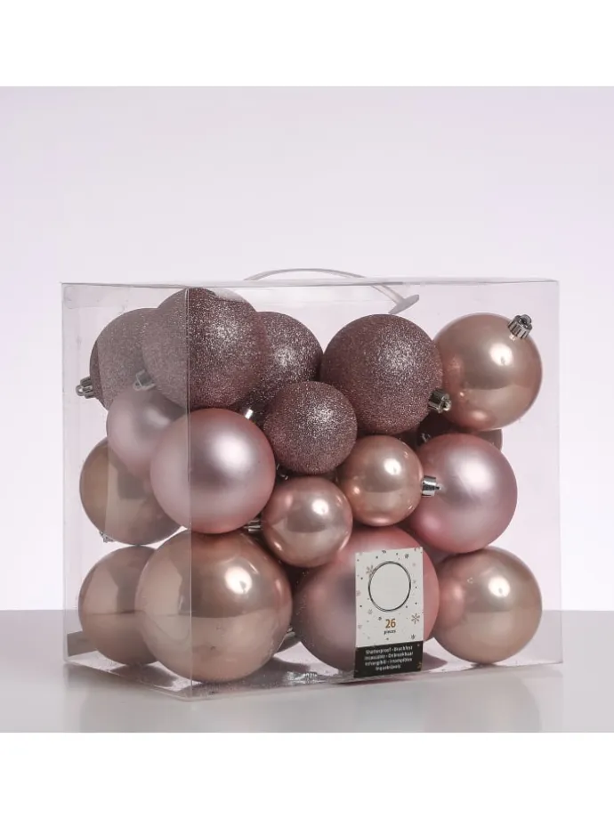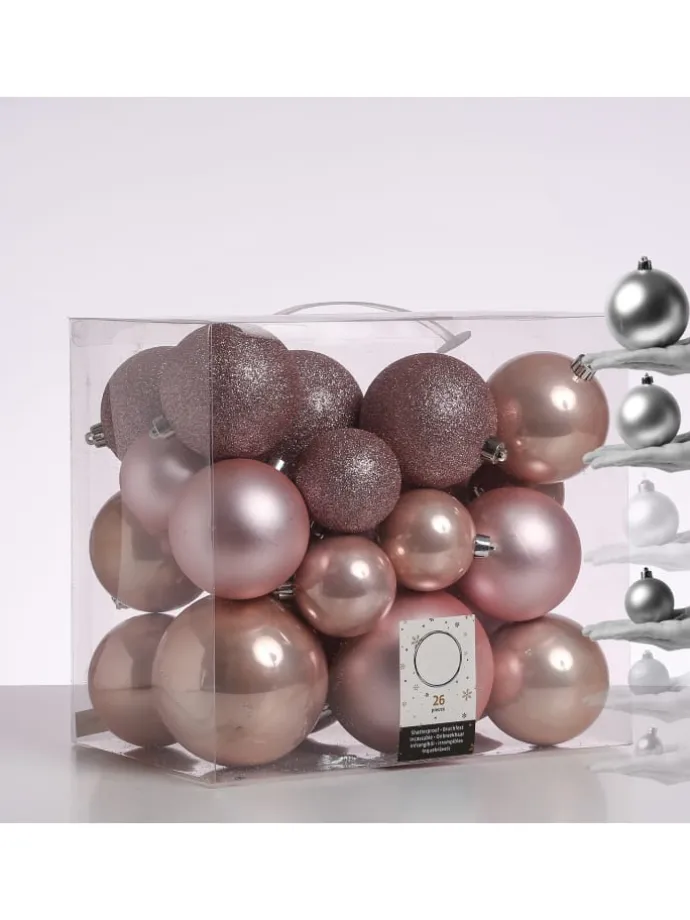 Christbaumkugel – Weihnachtsbaumkugel – bruchfest – glänzend, matt und glitzernd – puderrosa – 26er Set Die wunderschönen puderrosafarbenen Christbaumkugeln aus Kunststoff sorgen nicht nur am Weihnachtsbaum in Deiner Wohnung für eine festliche Stimmung. Die Baumkugeln sehen auch besonders gut als Deko für Fenster, Schalen und Glasgefäße aus. Aber auch im Adventskranz, in Adventssträußen oder Gestecken können die Christbaumkugeln hervorragend dekoriert werden.