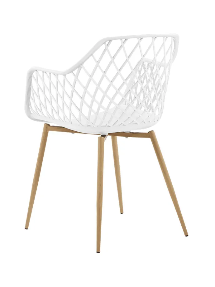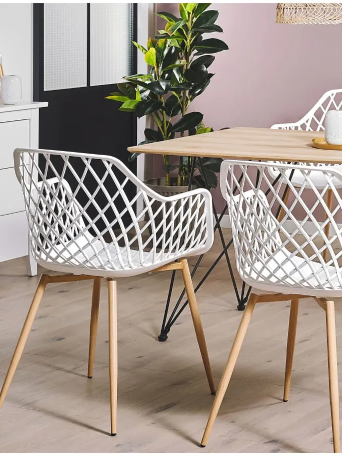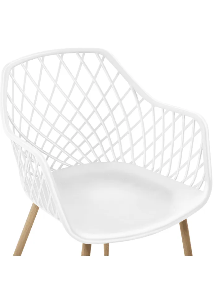 Moderner weißer Plastikstuhl im edlen Rautendesign im 2er Set. Die Sitzflächen und die Rückenlehnen dieses Sets sind aus pflegeleichtem Kunststoff gefertigt, der seinen frischen Look langfristig beibehält. Das durchgehende Rautenmuster ist ein absoluter Hingucker und wird Ihre Gäste begeistern. Der fliessende Übergang von den Rücken- zu den Armlehnen macht diese Kunststoffstühle sehr bequem und lädt zum Verweilen ein. Ihre Metallbeine in Holzoptik veredeln das Design und geben eine gute Standfestigkeit.