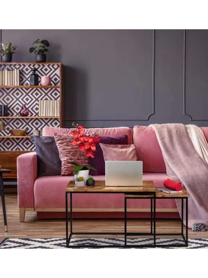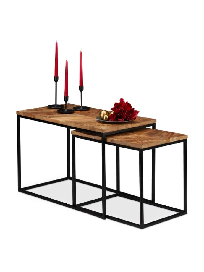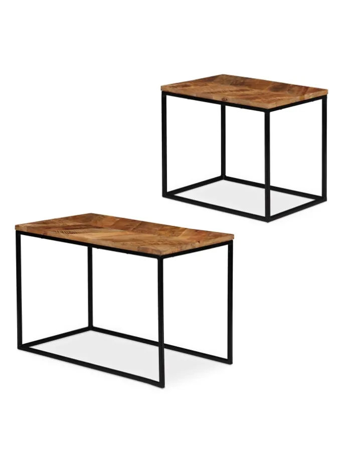Die Couchtische im 2er Set bilden ein kongeniales Team, das nur darauf wartet, Ihren Räumen ein großes Plus an Natürlichkeit zu bescheren. Die aus Mangoholz gefertigten Tischplatten lockern mit ihren einzigartigen Maserungen jedes Wohnambiente auf. Die Gestelle in dezentem Schwarz sorgen für Stabilität und einen festen Stand. Dank der Satztische sind Snackschalen, Zeitschriften oder Handys immer in Reichweite. Die rechteckigen Tische lassen sich platzsparend zusammenschieben.