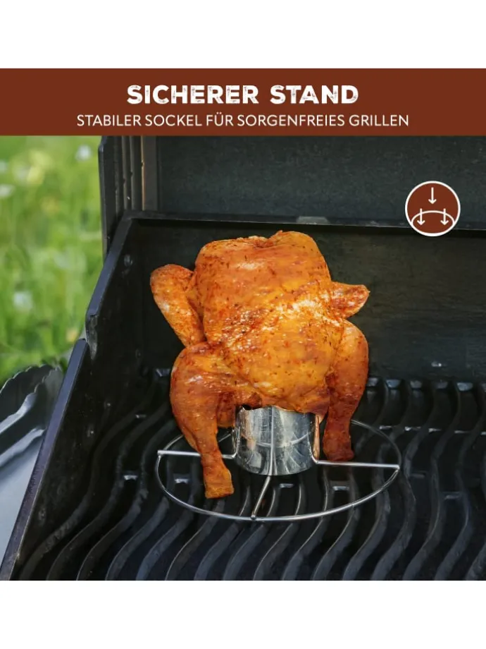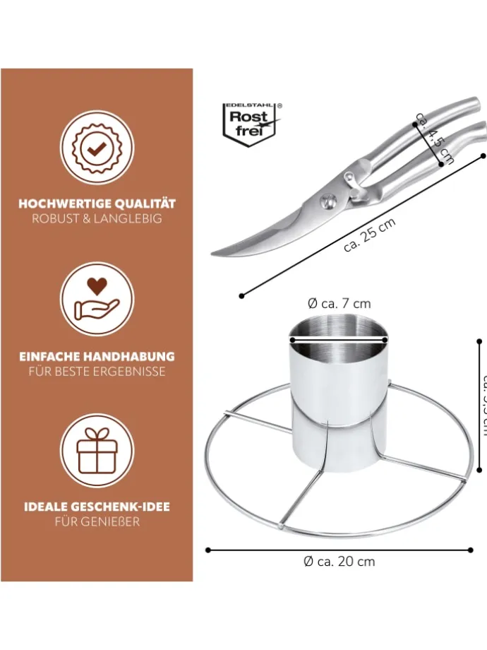 Das clevere Set für ein Grillhähnchen oder anderes Geflügel. Egal ob im Backofen oder auf dem Grill, mit dem Grillständer und der Geflügelschere haben Sie das Rüstzeug für die gelungene Zubereitung und das sichere Zerteilen.