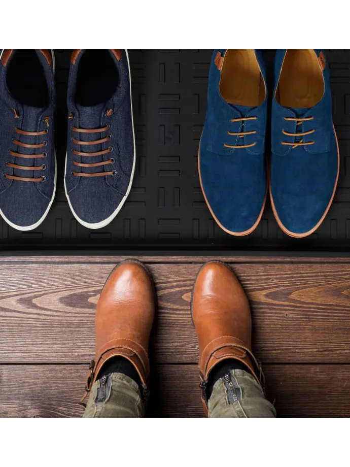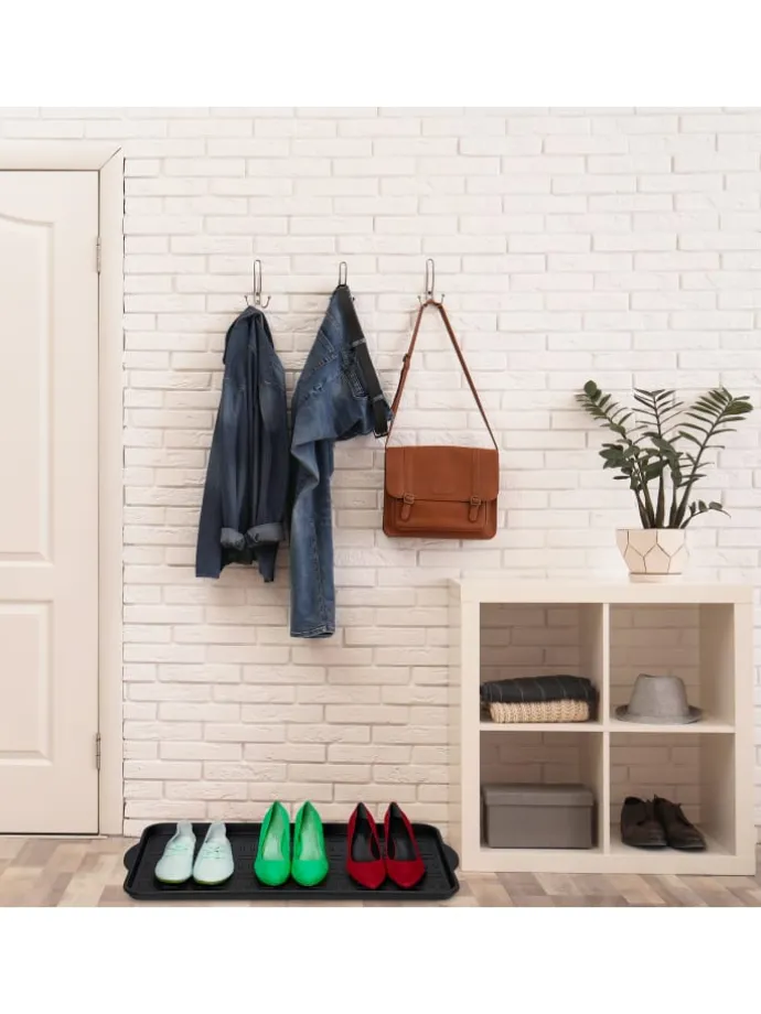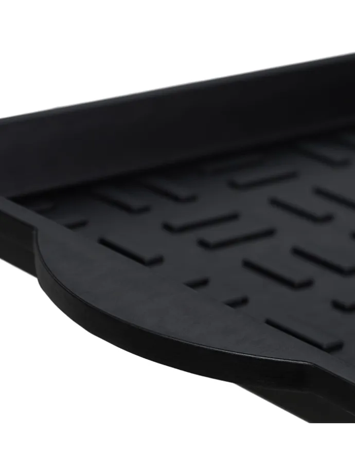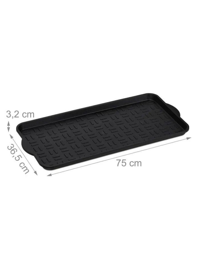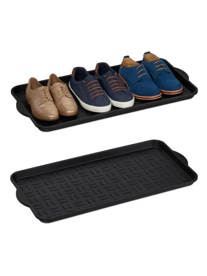 Wer nach einem Regenschauer nach Hause kommt, kennt das Problem: Die Schuhe sind tropfnass und am Boden bilden sich Pfützen. Mit den großen Schuhabtropfschalen im 2er Set schützen Sie nicht nur Ihr Parkett vor Verunreinigungen, sondern lassen auch Ihre Schuhe schneller trocknen. Das schwarze Schuhtablett aus robustem Kunststoff besitzt ein tiefes Profil, das verhindert, dass Ihre Schuhe im Tropfwasser stehen. Der hohe Rand verhindert ein Überlaufen.