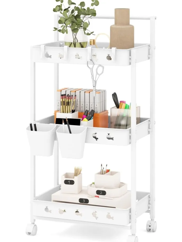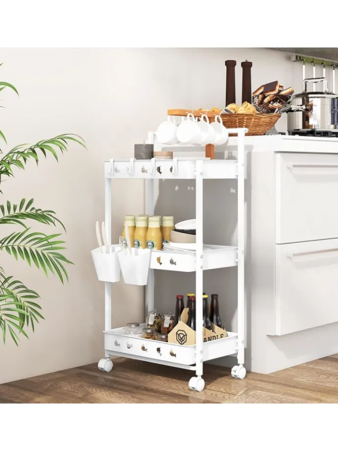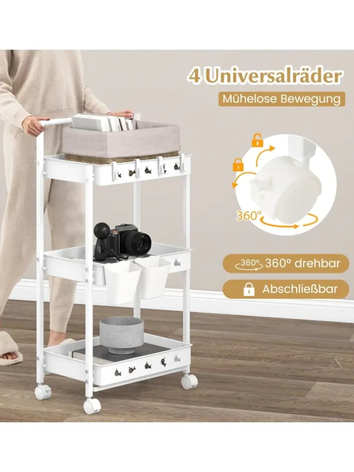 Machen Sie sich bereit, Ihre Organisation mit unserem dreistufigen Aufbewahrungswagen zu revolutionieren! Dieser elegante und stilvolle Wagen bietet auf 3 Ebenen reichlich Stauraum sowie 2 Hängebecher und 4 abnehmbare Haken für endlose Aufbewahrungsmöglichkeiten. Mit vier 360°-Rollen, von denen zwei feststellbar sind, gleitet dieser Wagen mühelos durch Ihr Zuhause und bietet gleichzeitig Stabilität dort, wo Sie sie am meisten brauchen. Darüber hinaus sorgt das ausgehöhlte Design des belüfteten Bodens für eine einfache Entwässerung und Belüftung. Egal, ob Sie Ihre Küche, Ihren Bastelraum, Ihre Garage oder Ihr Badezimmer aufräumen müssen, dieser robuste und schicke Wagen ist die perfekte Lösung für Ihren geschäftigen Lebensstil. Begrüßen Sie ein aufgeräumtes Zuhause!