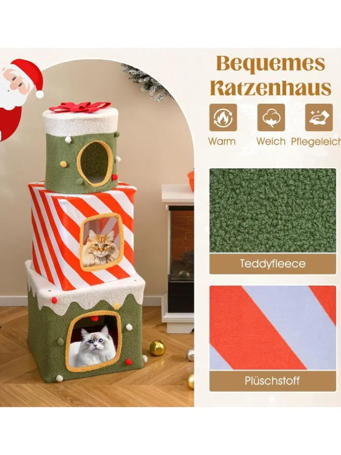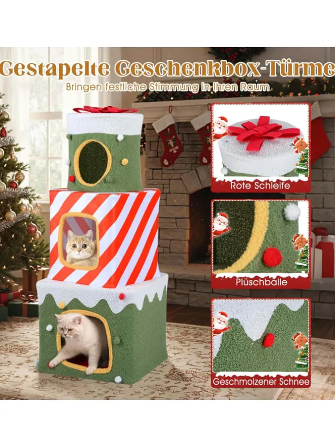 Bringen Sie festliche Stimmung in Ihr Zuhause mit dem weihnachtlich gestalteten Katzenbaum. Dieser Turm ist als stapelbarer Geschenkbox-Turm konstruiert und dient sowohl als kuscheliger Unterschlupf für Ihre Katzen als auch als einladendes Dekorelement. Mit 3 halboffenen Wohnungen in verschiedenen Höhen finden Ihre Katzen ruhige Plätze zum Schlafen und beste Aussichtspunkte zum Beobachten ihres Reviers. Ein hängender Ball sorgt für Spiel und Bewegung. Der Innenbereich aus Plüschstoff und Teddy-Fleece bietet Wärme und Komfort, ideal für drinnen. Verziert mit Schleife, Zuckerstangen-Akzenten und Schneerand verleiht das niedliche Katzenhaus jedem Raum eine bezaubernde Winteratmosphäre.