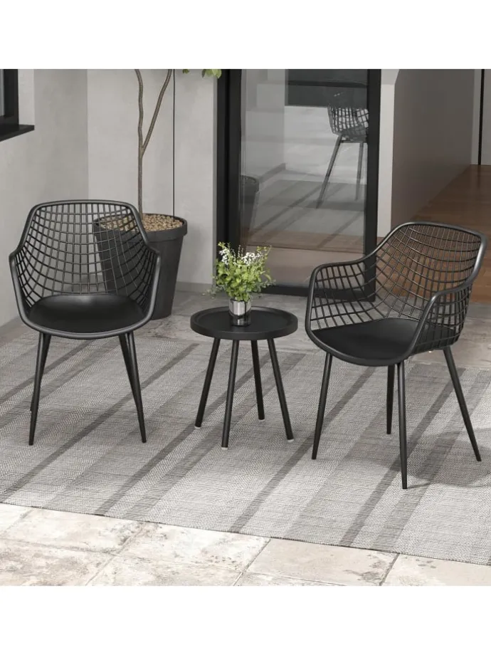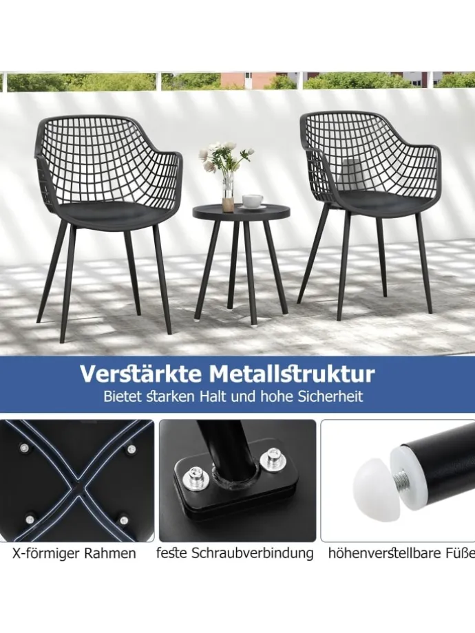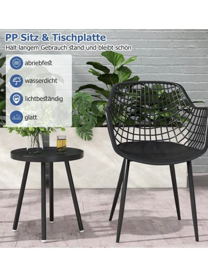 Dieses Bistro-Set verfügt über Sitzfläche und Tischplatte aus PP, die auch längerer Nutzung standhalten und schön bleiben. Das ergonomische Design der Stühle mit konturierten Sitzflächen und atmungsaktiven Rückenlehnen sorgt für Komfort bei langen Entspannungsphasen, während der einzigartig gestaltete konkave Tisch Ihre Getränke und wichtigen Utensilien sicher hält. Darüber hinaus bieten die robuste Metallstruktur und die verstellbaren Fußpolster starken Halt und hohe Sicherheit. Machen Sie dieses vielseitige Set zu einem Teil Ihres Wohnraums und verwandeln Sie Ihre Umgebung in eine Oase der Ruhe.