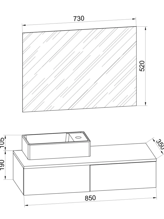 Das Set besteht aus einem Spiegel und einem Waschbecken mit Waschbeckenunterschrank. Eine sehr elegante Einrichtungslösung für WCs oder Gästetoiletten, um ein optisches Highlight zu setzen.