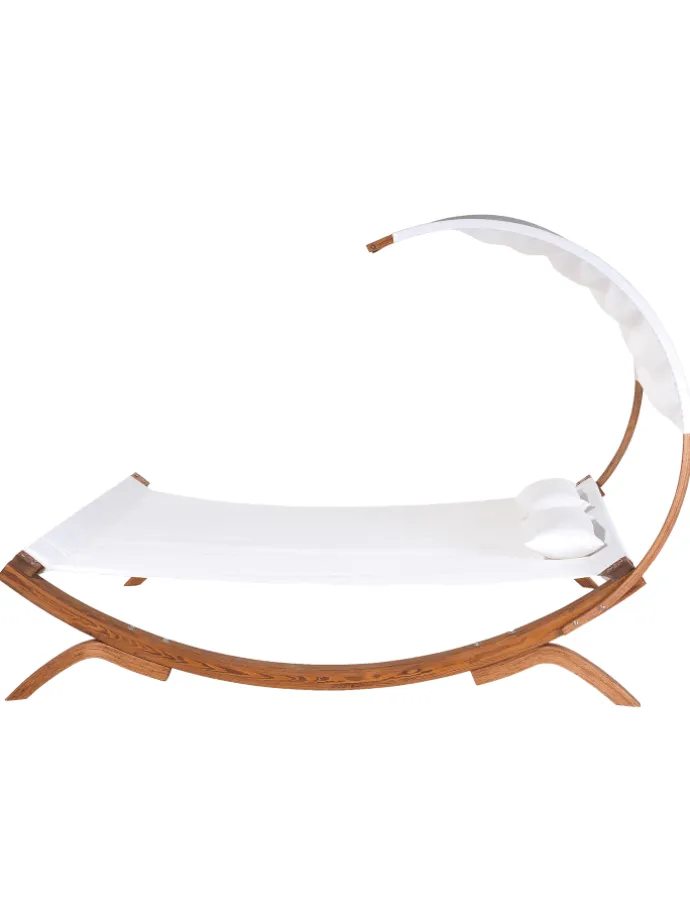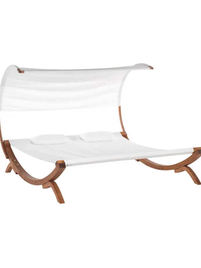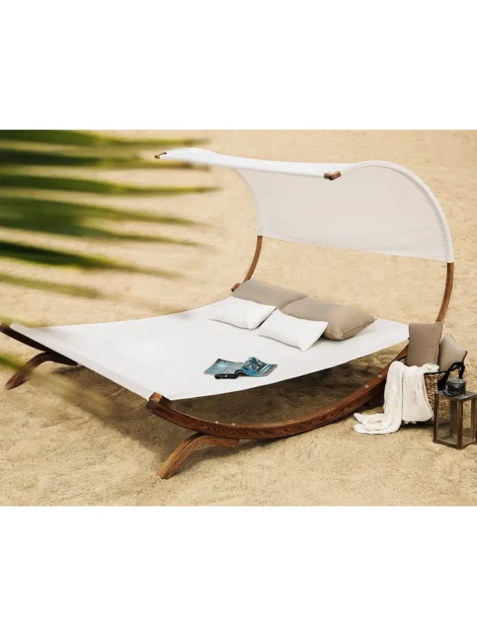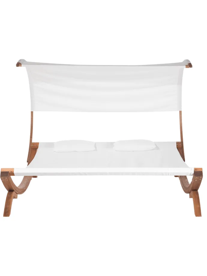 Traumhaft schöne Doppelliege aus Lärchenholz mit Sonnendach. Die robuste, strapazierfähige Bespannung der Sonnenliege verspricht optimalen Liegekomfort mit ausreichend Platz für 2 Personen. Das große Sonnendach schützt perfekt vor starker Sonneneinstrahlung. Das pflegeleichte Material aus beständigem Polyester passt mit seinem hellen, sommerlichen Cremeweiß ausgezeichnet zu dem stabilen Gestell aus hochwertigem Lärchenholz in einem warmen Teakholzfarbton. Mit ein paar Handgriffen kann das Gestell des Sonnendachs auseinander genommen werden. So können Sie das Sonnendach ganz leicht abnehmen und waschen.