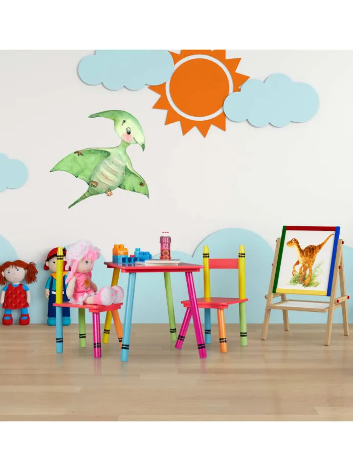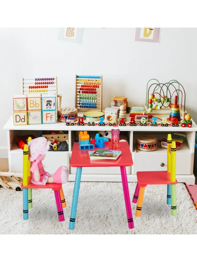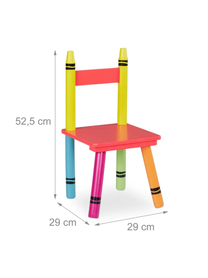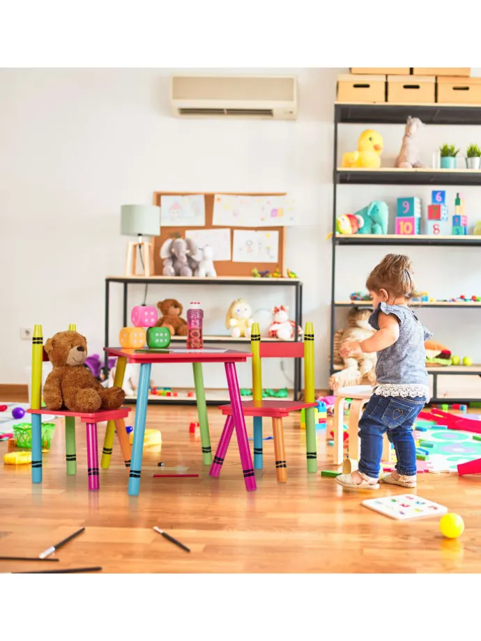Diese niedliche Kindersitzgruppe ist eine tolle Sitzgelegenheit für das Kinderzimmer. Das 3-teilige Set besteht aus einem Kindertisch und 2 Stühlen. Lass Deine Kleinen selbstständig an dem geräumigen Basteltisch malen, spielen oder essen. Dank der niedrigen Sitz- und Tischhöhe können 2 Kinder bequem auf der Kinder-Sitzgarnitur Platz nehmen und sich wie die Großen fühlen. Die robuste Kindersitzecke überzeugt dabei mit ihrem farbenfrohen Wachsmalstift Design, das Kinderaugen zum Strahlen bringt.
