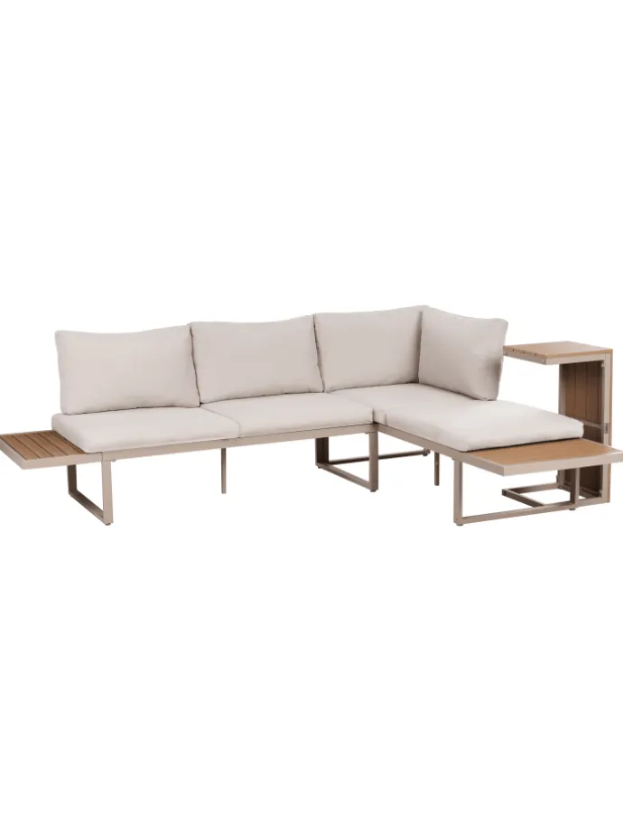 Kompaktes, modulares Gartenlounge Set aus beigem Aluminium und hellem Kunstholz. Dieses Lounge-Set besteht aus zwei Sofas, die jeweils mit zwei Sitzplätzen und einer Ablagefläche ausgestattet sind, sowie einem Tisch, der über ausreichend Platz für Getränke und Snacks verfügt. Man kann die beiden Sitzer einzeln nutzen oder sie zu einer gemütlichen Sofaecke oder Couch zusammenschieben. Die hochwertigen Gestelle aus pulverbeschichtetem Aluminium werden mit strapazierfähigem Kunstholz in einem warmen Teak-Farbton kombiniert. Dank des Polyester-Schaumstoffkerns fühlen sich die Kissen angenehm weich an und bieten gleichzeitig eine stabile Unterstützung beim Sitzen. Die abnehmbaren und waschbaren Bezüge in Beige vervollständigen den modernen Look der Möbel.