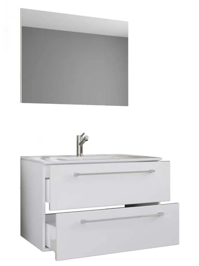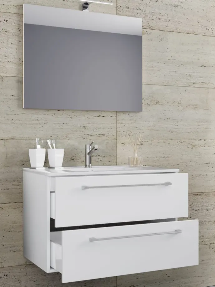 Ein modernes Waschbecken aus massiver Keramik und einem Spiegel strapazierfähigem Glas runden das Möbel ab, um den perfekten Blickfang im Badezimmer zu erhalten.