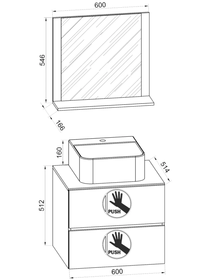 Das Badmöbel-Set besteht aus einem Unterschrank mit zwei Schubladen auf robusten Metallschienen. Das Möbel ist mit einer praktischen Push-to-Open-Funktion ausgestattet.