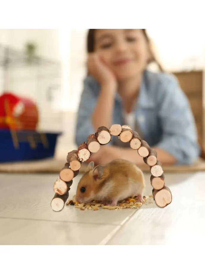 Mit den 3 Käfigbrücken aus Kirschholz gestaltest Du Hamstern, Rennmäusen und Co. eine abwechslungsreiche Gehegelandschaft. Die Nagertreppen bestehen aus einzelnen Zweigen, die mithilfe von Draht zusammengehalten werden und lassen sich dadurch flexibel biegen. So können die Hamsterleitern nicht nur als Rampe oder Brücke zwischen verschiedenen Käfigelementen zum Einsatz kommen, sondern auch als Tunnel oder Unterschlupf genutzt werden. Die natürliche Rinde ist dabei der Traum eines jeden Nagetiers!