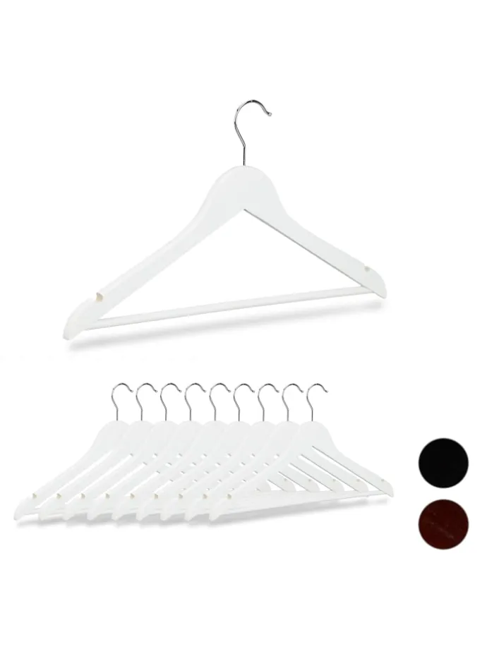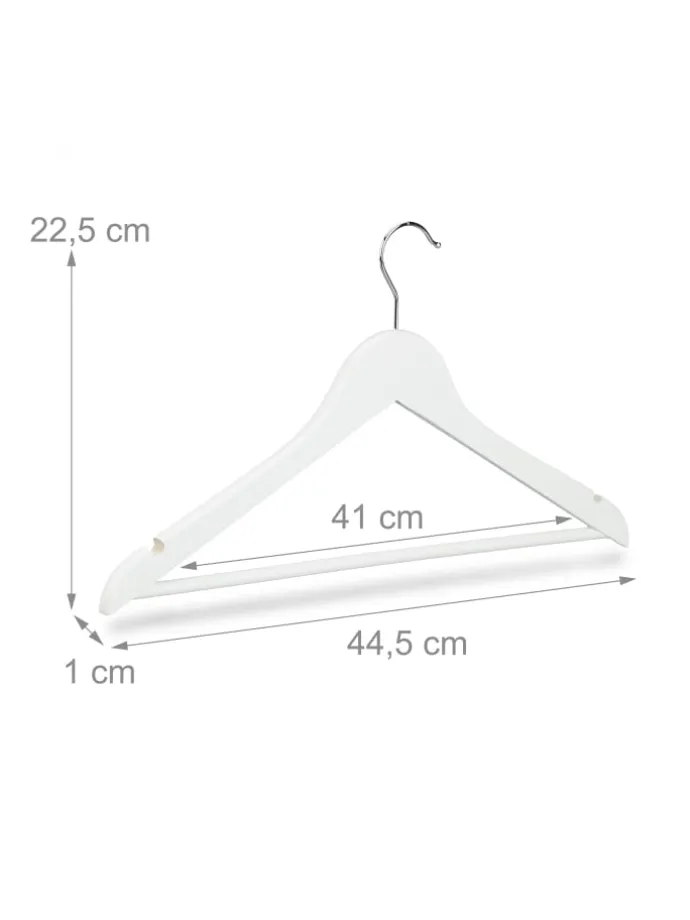 Wenn Sie Wert auf knitterfreie Kleidung und mehr Übersicht im Kleiderschrank legen, ist das Kleiderbügel Set genau das Richtige für Sie. Die 30 Holzbügel sorgen für einen einheitlichen Look in Ihrer Garderobe. Hängen Sie Kleider, Hemden, Blusen oder Shirts auf. Dank des Hosenstegs überzeugen die Bügel als Hosenbügel für Anzughosen, Jeans und mehr. Die Garderobenbügel tragen auch schwere Kleidungsstücke wie Winterjacken zuverlässig.