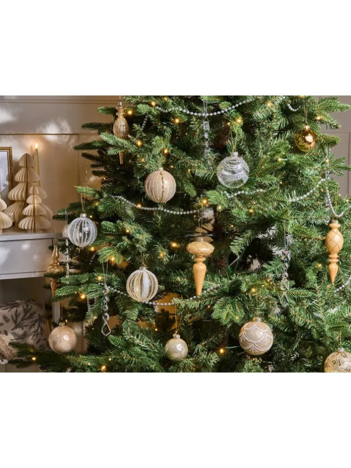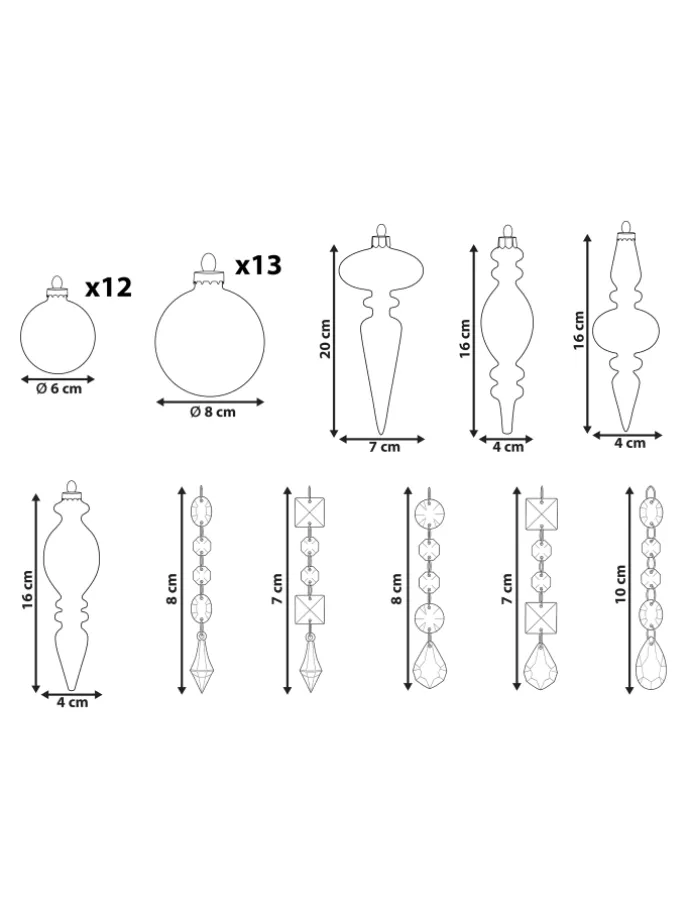 Handgefertigtes Christbaumschmuck-Set mit 35 Elementen. Dieses mehrteilige Baumschmuck-Set sorgt dafür, dass Ihr Weihnachtsbaum immer ein echter Blickfang ist. Neben klassischen goldenen Kugeln und Eiszapfen-Modellen enthält das Set einzigartige silberne Anhänger, die aus miteinander verbundenen kleinen Deko-Elementen bestehen und eine dezente, schimmernde Kette bilden. Jede der Glaskugeln ist mit Glitzerstaub verziert und verleiht Ihren Weihnachtsarrangements einen faszinierenden Glanz.
