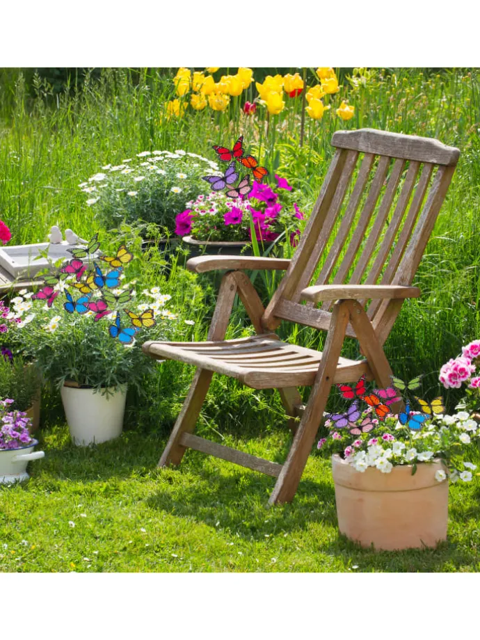 Wer erfreut sich nicht an den flatternden Faltern? Da sie im Garten leider nicht so oft anzutreffen sind, sind die Schmetterlingsstecker im praktischen XXL Pack ein schöner Ersatz. Die bunten Flügel aus Kunststoff halten auch schlechtem Wetter stand. Durch die Vielzahl an Farben strahlen auch triste Pflanzen ohne Blüten nur so vor Farbenpracht. Die Metallstäbe lassen sich leicht in die Erde eines Pflanzkastens oder Blumentopfes auf dem Balkon stecken. Auch auf Gartenwiesen ist dieser Insektenschwarm ein zauberhafter Hingucker. Verschönern sie auch Blumentöpfe im Kinderzimmer mit den niedlichen Schmetterlingen.