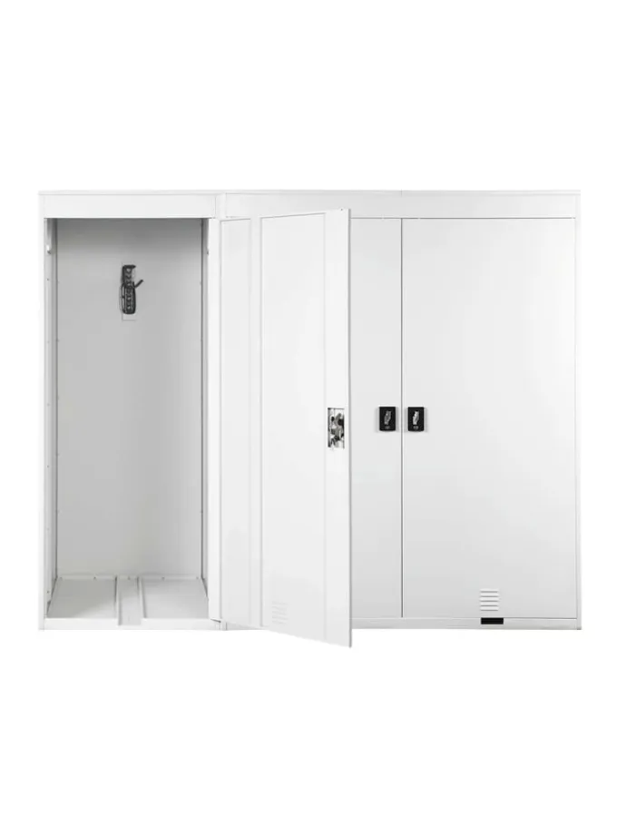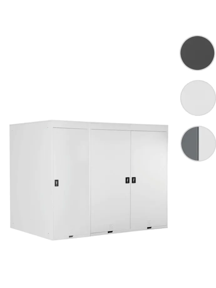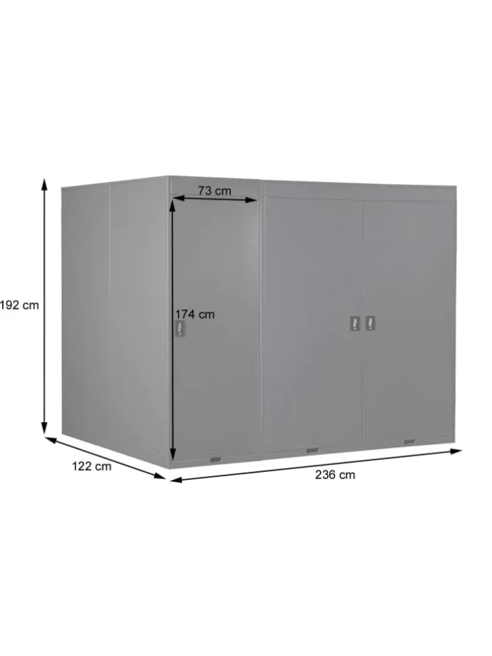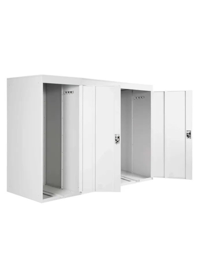 In der Fahrradbox ist Platz für drei Räder, diese werden an einer Vorrichtung mit dem Vorderrad aufgehängt. Praktischerweise finden Sie in den Kabinen, zwei Hakenleisten mit je vier Haken, an denen Sie zum Beispiel Ihren Helm, Regenkleidung, Fahrradschlösser oder Ähnliches verstauen können. Auch nasse Kleidung kann problemlos in der Box untergebracht werden, da durch luftdurchlässige Aussparungen für eine gute Luftzirkulation gesorgt ist. Die Türen sind selbstverständlich abschließbar, so sind Ihre Fahrräder immer vor Diebstahl und schlechtem Wetter geschützt.