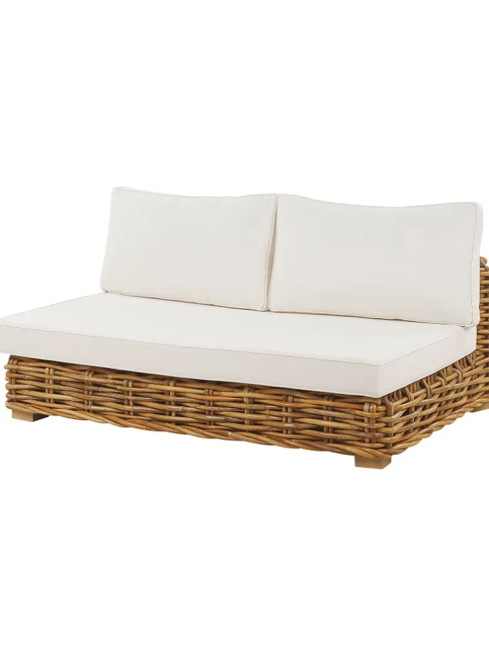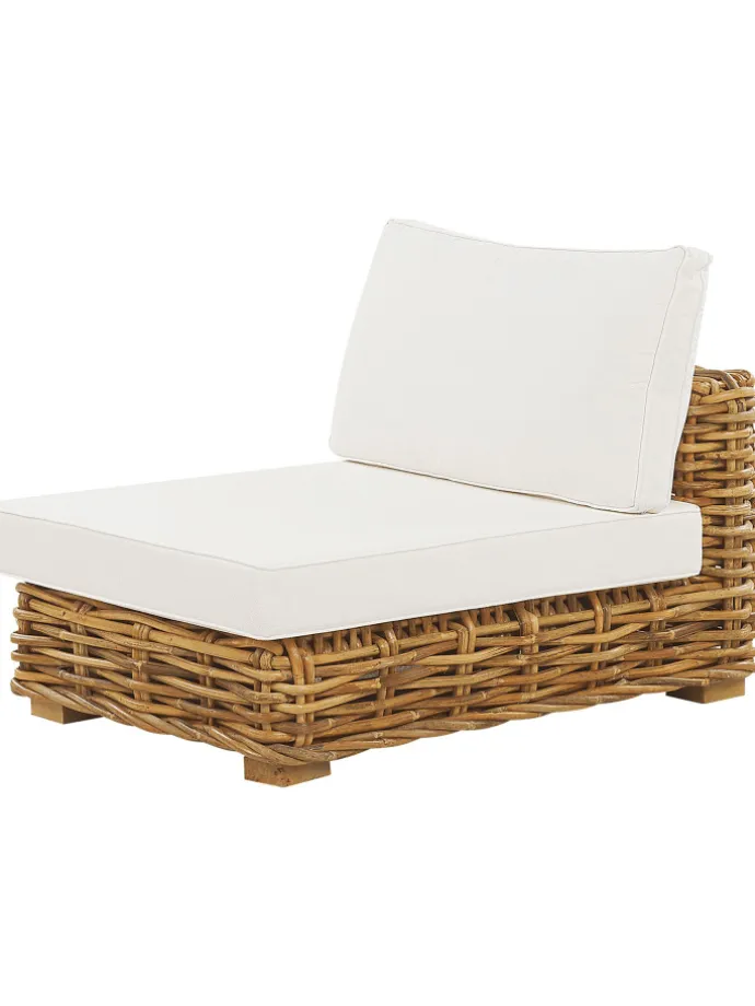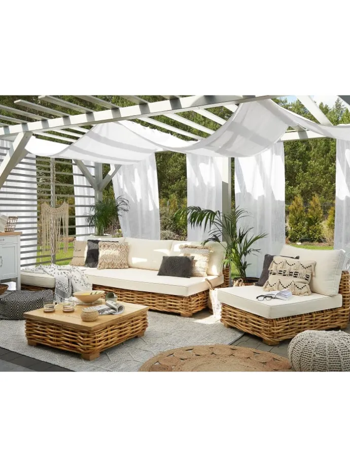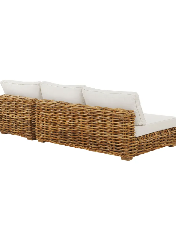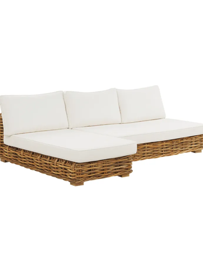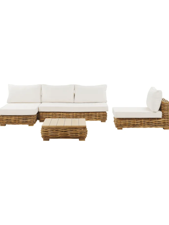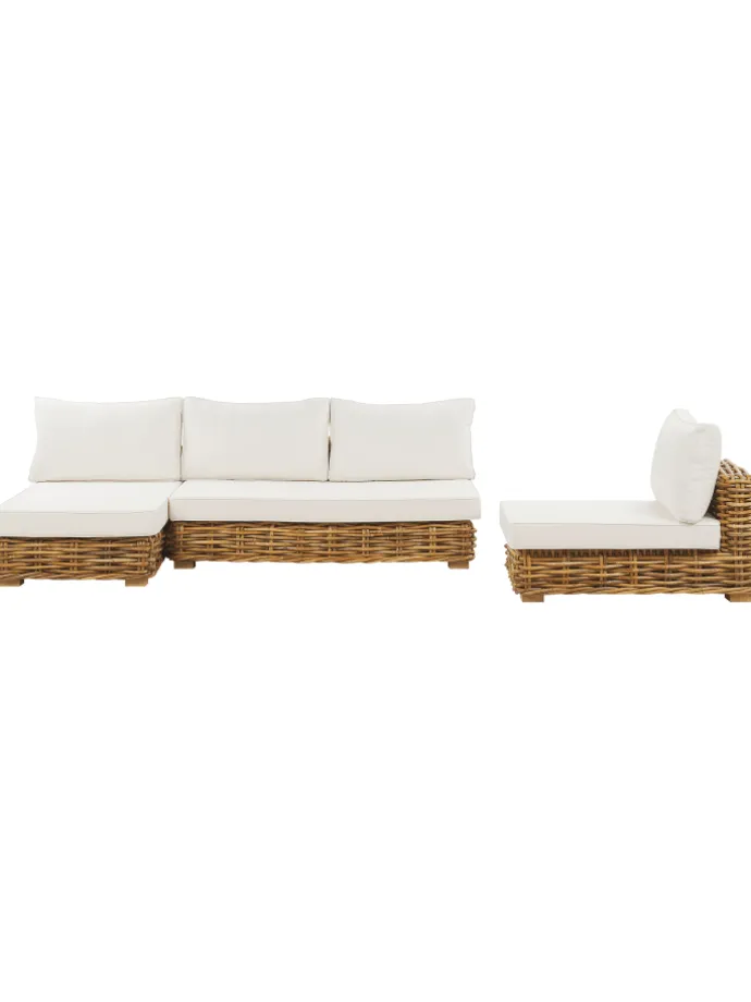 Modulares, rechtsseitiges Boho Gartenlounge Set mit grossen Kissen und Lounger. Mit diesem großzügigen Gartenmöbelset wird Ihre Terrasse zum Lieblingsort der ganzen Familie. Die Rattan-Sitzgruppe besteht aus drei modularen Teilen, die je nach persönlichen Vorlieben zusammengestellt werden können. Zum Set gehört ein niedriger Couchtisch mit einer quadratischen Mahagoniholz-Tischplatte in einer hellen, natürlichen Optik. Die en Sitz- und Rückenkissen laden zum Relaxen ein und sind wegen abnehmbarer Bezüge einfach zu pflegen.