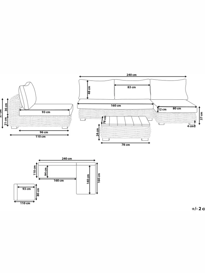 Sie kaufen: 1 x Couchtisch, 1 x Sofa, 1 x Sessel, 1 x Gartenliege