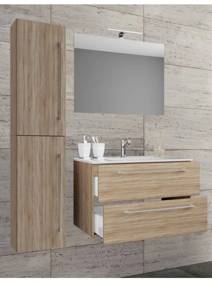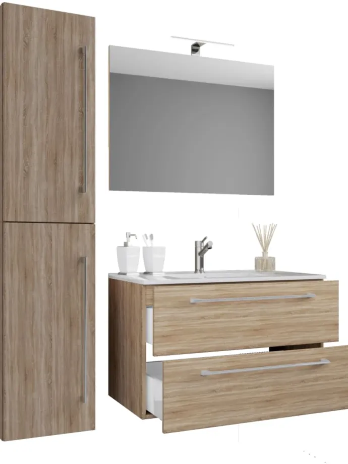 Das Badmöbel-Set „Badinos“ besteht aus einem Unterschrank mit zwei Schubladen auf robusten Metallschienen, einem Hochschrank und einem Spiegel aus ESG-Sicherheitsglas. Das moderne Waschbecken aus massiver Keramik dient als Blickfang und verleiht Ihrem Badezimmer ein ganz besonderes Ambiente.