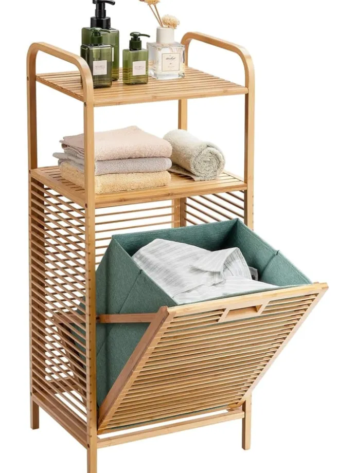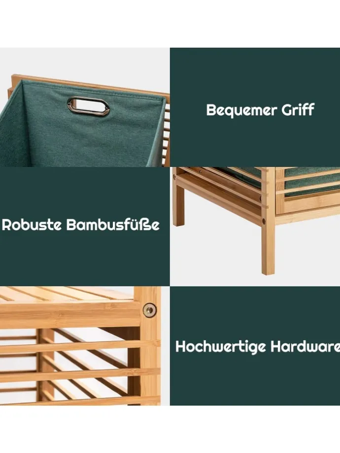 Um reichlich Stauraum zu bieten, haben wir ihn mehrschichtigentworfen. Der ausklappbare Bambus-Korbständer mit 2 Etagen und 1 herausnehmbaren Einlegeboden kann viele Haushaltsgegenstände aufnehmen und spart viel Platz.