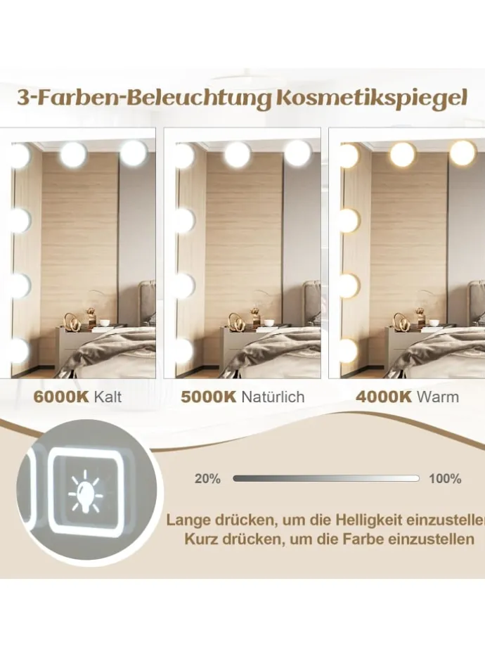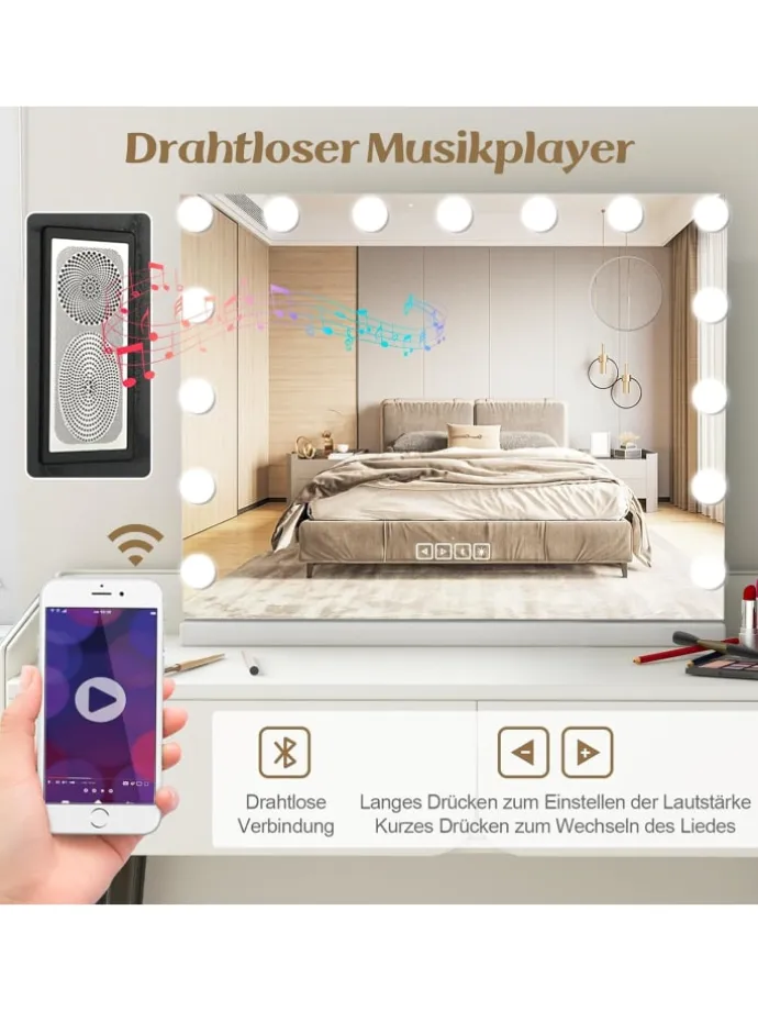 Erzielen Sie Make-up-Ergebnisse auf professionellem Niveau mit unserem Kosmetikspiegel mit dreifarbiger Beleuchtung. Darüber hinaus verfügt er über zwei kabellose Lautsprecher und einen USB-Ladeanschluss, was ihn sowohl für Unterhaltung als auch zum Aufladen Ihrer Geräte praktisch macht. Je nach Bedarf können Sie mit der Touchsteuerung die Beleuchtung und Lautstärke mühelos durch einfaches Berühren des Bildschirms anpassen. Der Spiegel verfügt außerdem über eine tragbare Lupe zum präzisen Auftragen und Ausbessern von Make-up und bietet zwei Montageoptionen für eine vielseitige Platzierung.