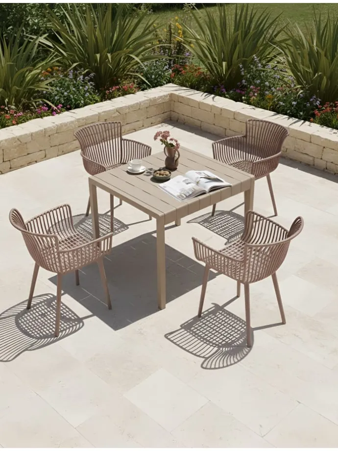 Braune Kunststoffstühle im praktischen 4er Set für den Innen- und Außenbereich. Dieses äußerst bequeme und praktische Stuhlset wertet jeden Raum auf. Die Stühle sind aus Kunststoff gefertigt, was den Vorteil hat, dass sie schmutzabweisend sind und sich sowohl für den Innen- als auch für den Außenbereich eignen. Mit der breiten Sitzfläche, der Rückenlehne und den Armlehnen sind sie eine ideale Ergänzung für den Essbereich, die Küche oder den Garten. Das Retro-Design verleiht jedem Einrichtungsstil einen Vintage-Touch.