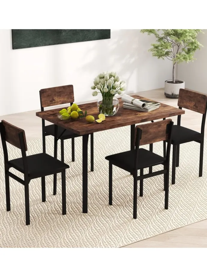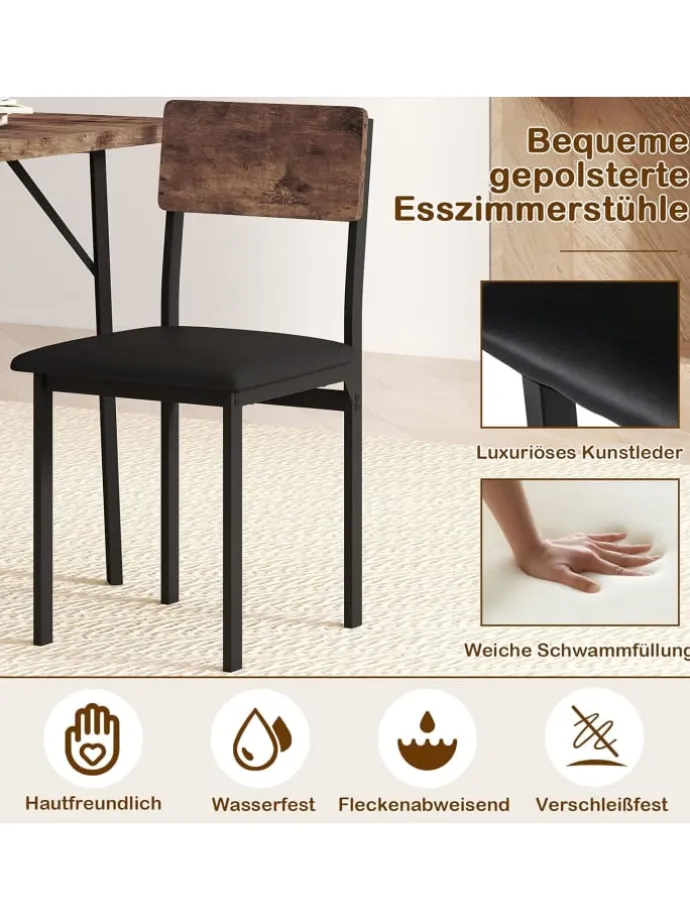 Entdecken Sie die ideale Kombination aus Stil und Funktionalität mit unserem 5-teiligen Set, bestehend aus einem eleganten rechteckigen Tisch und vier komfortabel gepolsterten Stühlen. Perfekt für jedes Esszimmer oder die Küche, bietet dieses Set bequem Platz für 4 Personen und eignet sich hervorragend für alltägliche Mahlzeiten oder gesellige Runden. Jeder Stuhl ist mit hochwertigem Kunstleder bezogen, das nicht nur Luxus ausstrahlt, sondern auch pflegeleicht, wasser- und fleckenresistent ist. Die robusten Metallrahmen von Tisch und Stühlen garantieren Haltbarkeit, ergänzt durch bodenschonende Fußpolster. Bei Nichtgebrauch lassen sich die Stühle vollständig unter den Tisch schieben – ideal für begrenzten Platz.