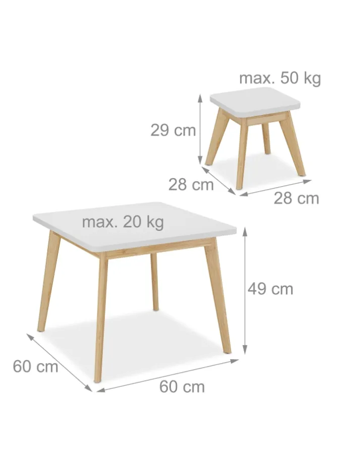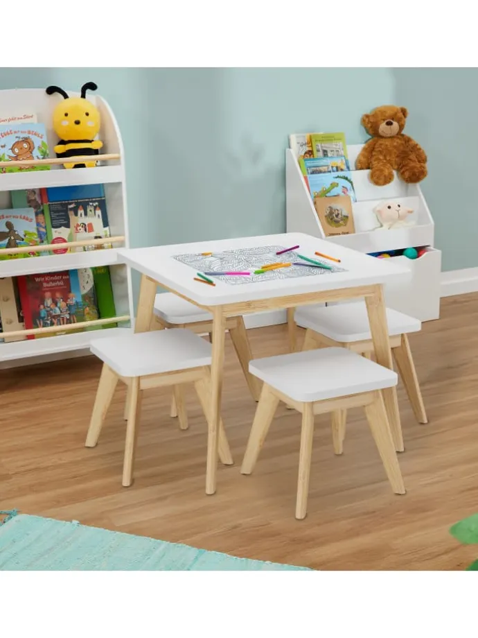 Diese Kindersitzgruppe ist eine tolle Sitzgelegenheit für das Kinderzimmer und fügt sich überall gut ein. Das 5-teilige Set besteht aus einem Kindertisch und 4 Hockern. Lass Deine Kleinen selbstständig an dem Basteltisch malen, spielen oder essen. Dank der niedrigen Sitz- und Tischhöhe können 4 Kinder bequem auf der Kinder-Sitzgarnitur Platz nehmen und sich wie die Großen fühlen. Die Beine aus natürlichem Bambus setzen dekorative Akzente und sorgen zugleich für einen sicheren Stand.