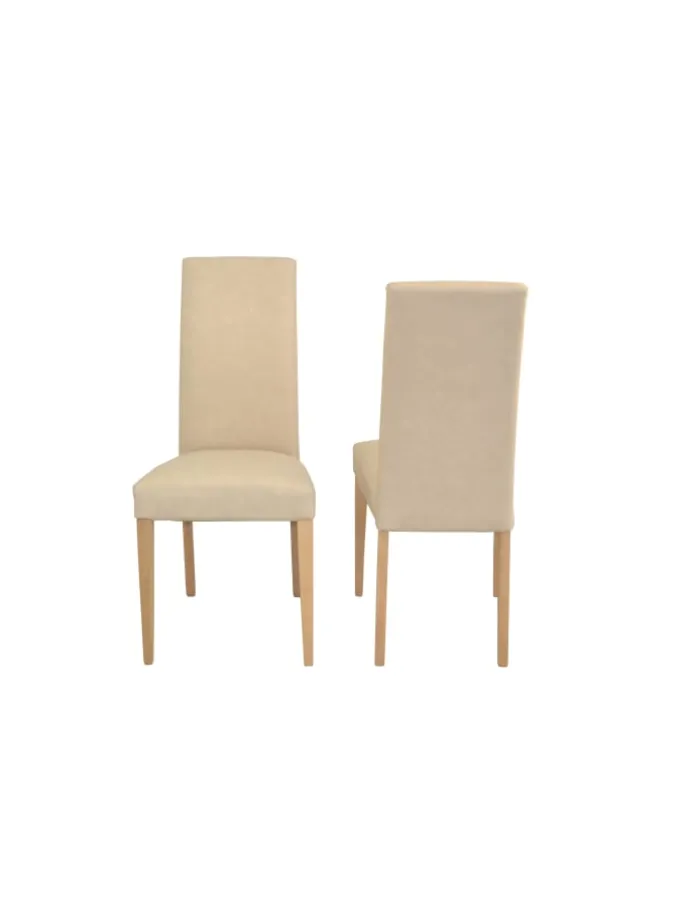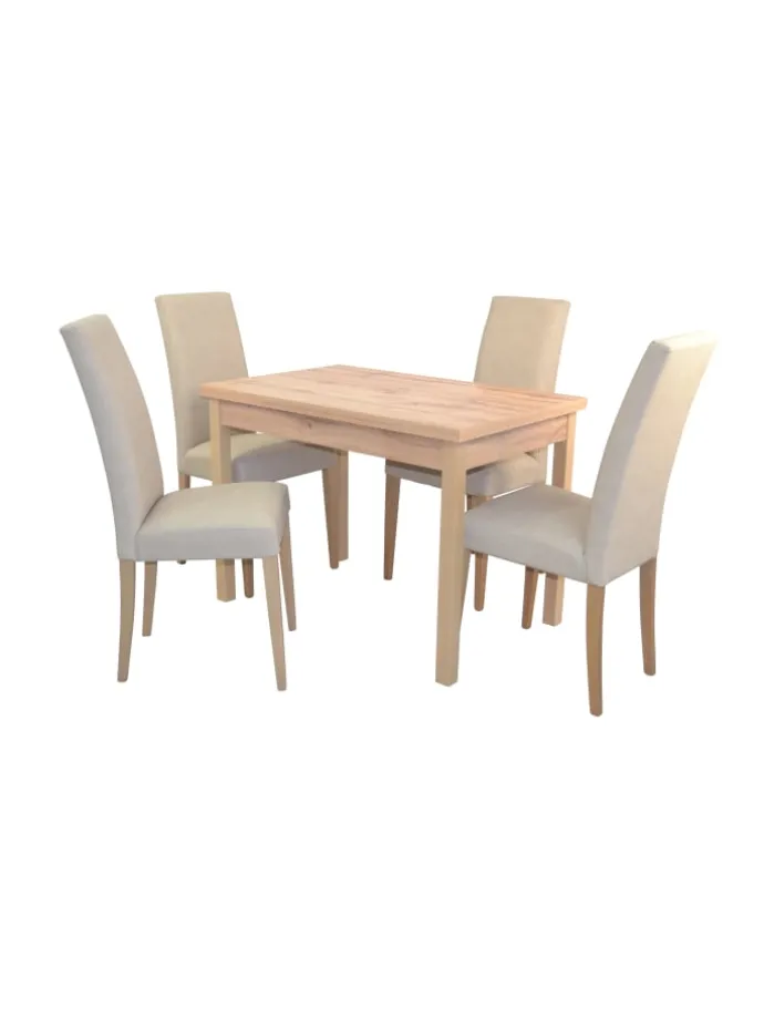 5teilige Tischgruppe bestehend aus 4 Stühlen und 1 Esstisch mit Auszugsfunktion. Esstisch mit vier Beinen aus Massivholz Buche, eichefarben gebeizt und lackiert. Tischplatten aus Holzwerkstoff mit einer Melaminbeschichtung, eichefarben. Unter der Tischplatte sind rechts/links jeweils eine ca. 30 cm Ansteckplatte eingeschoben. Diese lassen sich einfach und schnell ausziehen, so ist die Tischplatte von 104 cm bis auf gesamt 164 cm vergrößerbar. Maße ca. cm: Breite 104-164 cm, Tiefe 67 cm, Höhe ca. 75 cm. Polsterstuhl mit Beinen aus Massivholz Buche, eichefarben gebeizt und lackiert. Sitz und Rücken sind schaumstoffgepolstert und mit einem trendigen Kunstlederbezug (75% Polyester/20% Baumwolle/5% Viskose) unifarben bezogen. Maße ca. cm: (B/H/T) 46/57/100. Sitzhöhe ca. 50 cm, Sitztiefe ca. 37 cm. Lieferung vom Esstisch erfolgt zur Selbstmontage, inklusive Aufbauanleitung, Stühle werden montiert angeliefert.