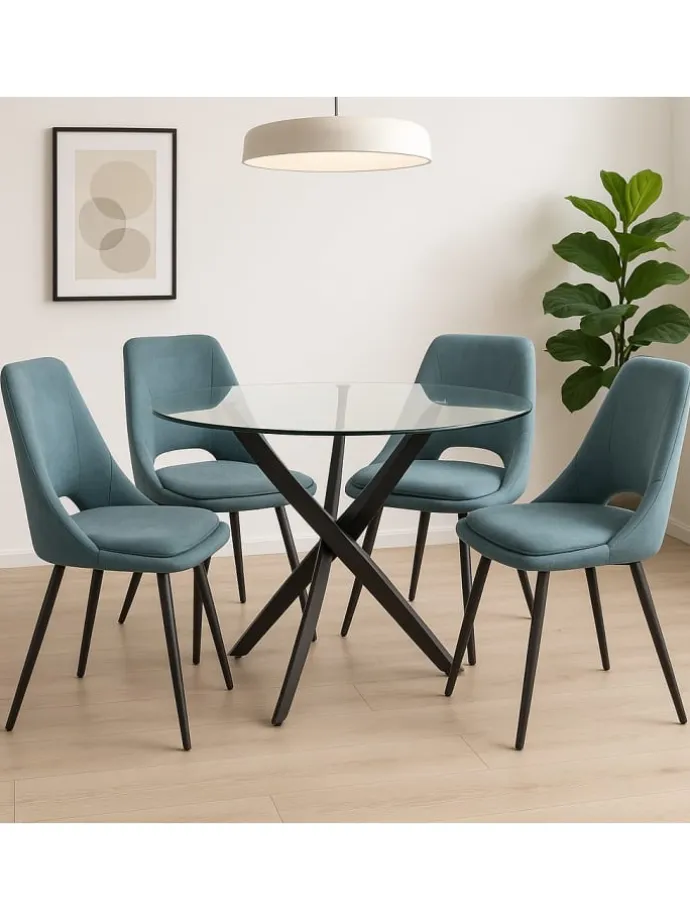 Moderne 5-teilige Tischgruppe mit Glas-Esstisch & 4 Polsterstühlen – stilvoll, bequem und pflegeleicht. Diese moderne 5-teilige Tischgruppe vereint stilvolles Design mit hohem Komfort. Der runde Esstisch mit einem Durchmesser von 110 cm besticht durch seine klare Sicherheitsglasplatte (10 mm stark) auf einem stabilen Gestell aus pulverbeschichtetem Vierkantstahl. Passend dazu ergänzen vier bequeme Polsterstühle mit schaumstoffgepolsterter Sitzschale und pflegeleichtem Stoffbezug in Uni-Farbe das Set. Die Stühle überzeugen mit ihrer ergonomischen Form, einer angenehmen Sitzhöhe von 48 cm und einer Belastbarkeit bis 130 kg. Ob für das Frühstück mit der Familie oder ein stilvolles Dinner – diese Essgruppe macht immer eine gute Figur. Die Lieferung erfolgt zur einfachen Selbstmontage inkl. bebilderter Aufbauanleitung. Maße Esstisch: Durchmesser 110 cm x Höhe 75 cm. Maße Stühle je (B/H/T) 48/86/55. Sitzhöhe ca. 48 cm/Sitzbreite ca. 40 cm, Sitztiefe ca. 43 cm.