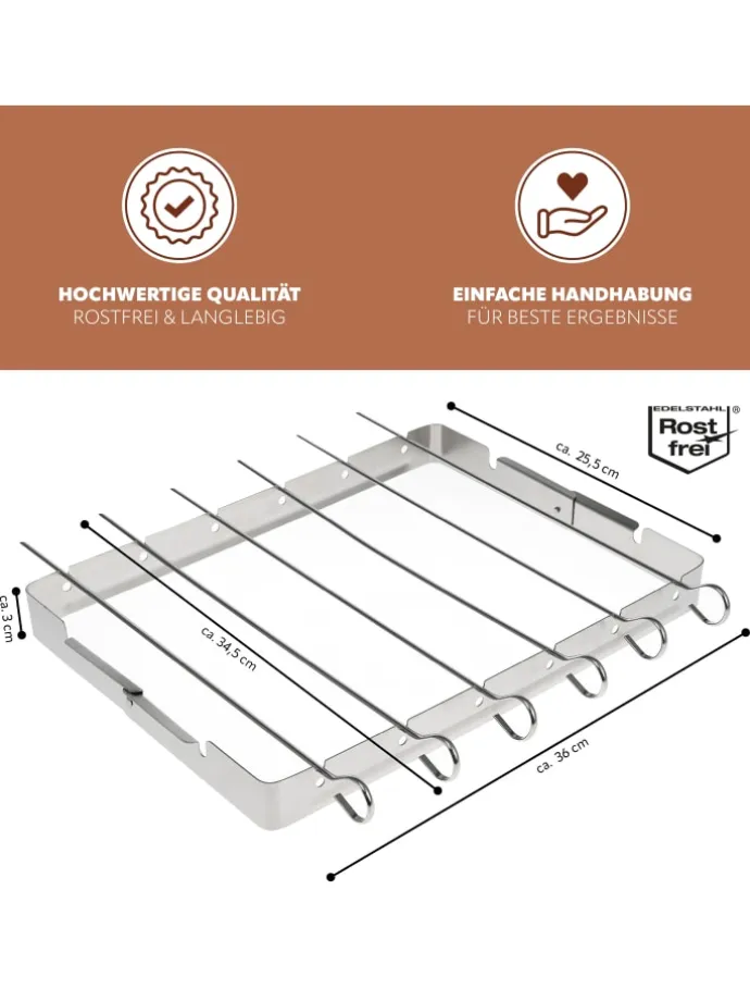 • 6 Grillspieße mit klappbarem Auflagerahmen