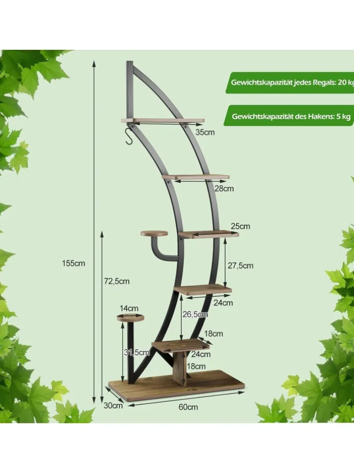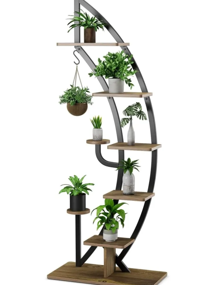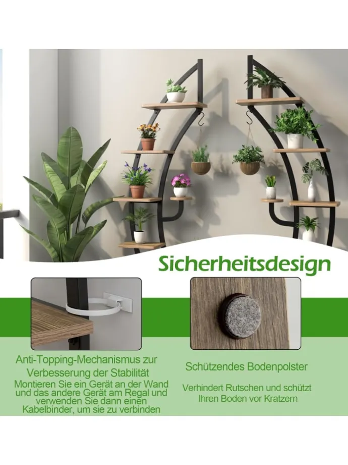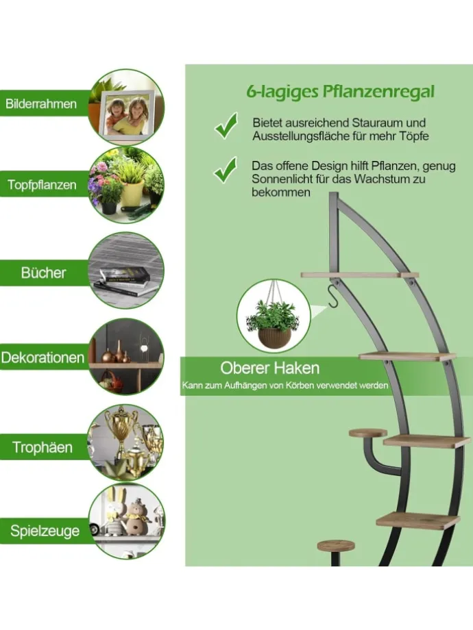 Unser 6-stöckiges Blumenregal aus Metall bietet ausreichend Platz, um Ihre verschiedenen Pflanzen und Dekorationen zu präsentieren, und macht Ihren Raum aufgeräumt und sauber. Sie können es als Ausstellungsregal verwenden, um Ihre Bücher, Sammlungen, Fotorahmen oder Trophäen im Eingangsbereich oder Wohnzimmer zu präsentieren. Und es hat eine geschwungene Form wie ein Halbmond, der sich in Ihrer Heimdekoration abheben kann. Darüber hinaus wird es von einem robusten, pulverbeschichteten Stahlrahmen getragen, der starken Halt bietet und eine große Ladekapazität gewährleistet. Und dank der Kippsicherung müssen Sie sich keine Sorgen machen, dass Ihre Lieblingspflanzen umkippen und zerstört werden.