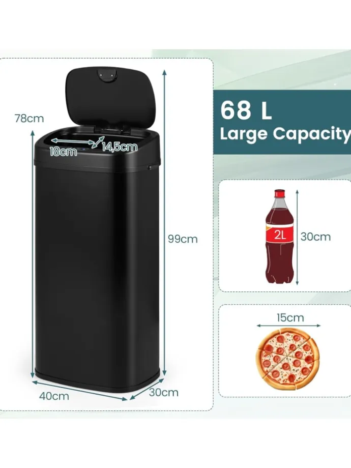 Dieser innovative Mülleimer bietet duale Zonen für Müll und Recyclingmaterialien, wodurch das Sortieren mühelos wird und Ihr Zuhause organisiert bleibt. Ausgestattet mit einem empfindlichen Infrarotsensor mit 15 cm Erfassungsbereich reagiert der Deckel bei erkannter Bewegung in 0,3 Sekunden und schließt automatisch nach 5 Sekunden, um unangenehme Gerüche effektiv einzuschließen. Mit großzügigem 68L Fassungsvermögen und einem langlebigen, fingerabdruckresistenten Metallrahmen ist dieser Abfalleimer leicht zu pflegen. Seitengriffe ermöglichen eine einfache Mobilität, während Schutzfüße den Boden schützen.