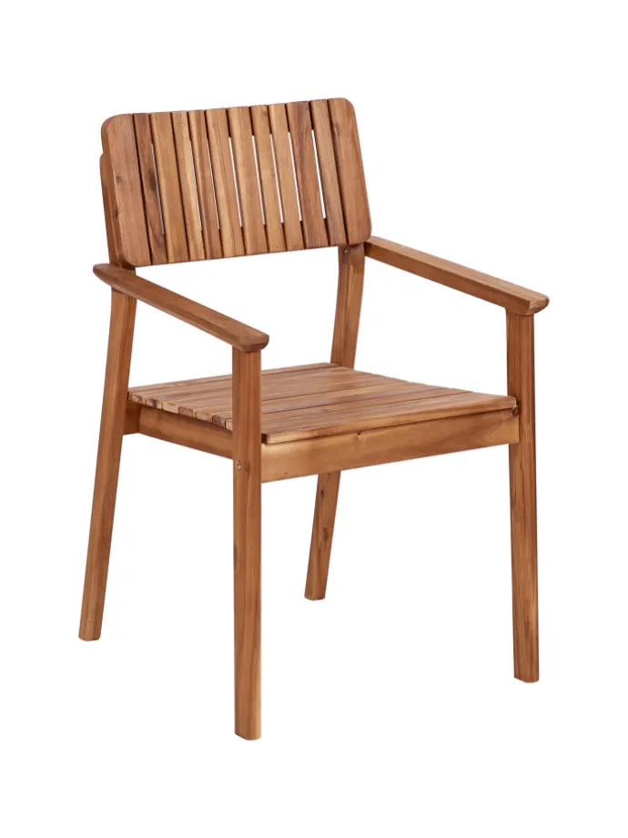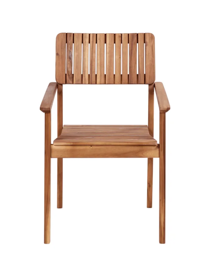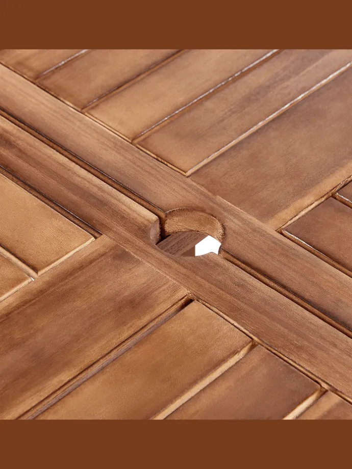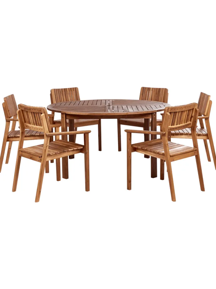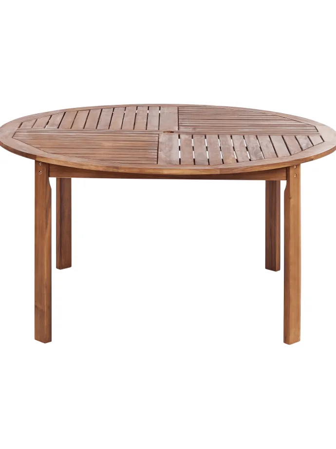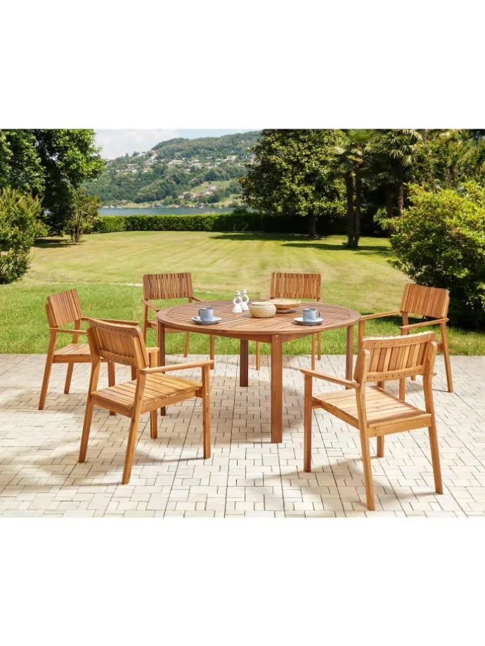 Runder Gartentisch mit 6 Stühlen aus Akazienholz. Dieser runde Esstisch und die 6 Stühle bestehen vollständig aus langlebigem, robustem Akazienholz und eignen sich dank ihrer warmen Holztöne und ihrer geölten, pflegeleichten Oberflächen perfekt für den Außenbereich. Sie verzaubern dabei mit ihrer einzigartigen Lattenoptik, die dem gesamten Set einen luftigen Charakter verleiht. Die Holzstühle besitzen bequeme, schlanke Armlehnen, die zusammen mit den hohen Rückenlehnen das Sitzvergnügen steigern. Bei der runden, breiten Tischplatte kann jeder Sitzende im direkten Blickkontakt zu allen Gästen stehen und dabei auch Ihre köstlichen Speisen bequem erreichen. So eignet sich das Gartentisch-Set nicht nur für etwas größere Familientreffen, sondern auch für einen intimen Kaffeeplausch unter Freunden. In der Tischplattenmitte befindet sich eine Öffnung, in der Sie Ihren Sonnenschirm platzieren können, um sich so ein schattiges Plätzchen zu zaubern.