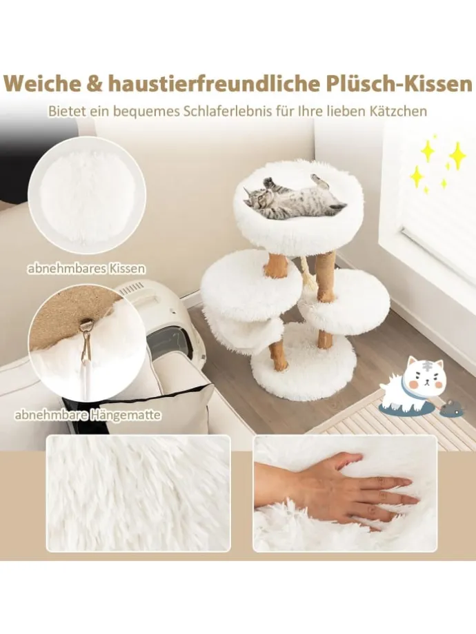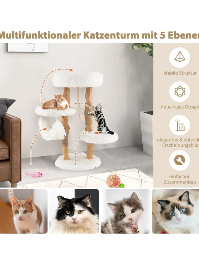 Holen Sie sich ein luxuriöses Aktivitätscenter für Ihr schönes Kätzchen! Unser Kratzbaum aus Massivholz misst 41 x 41 x 87 cm (L x B x H) und verfügt über 5 Etagen, sodass Ihre Kätzchen genügend Platz zum Erkunden, Ausruhen, Spielen und Entspannen haben. Insbesondere verwendet er einen Stützrahmen aus massivem Birnbaumholz, der ein stabiles Stützsystem bietet, das Haltbarkeit und Langlebigkeit gewährleistet. Und jeder Holzstamm kann in seiner Form unterschiedlich sein, was ihn zu einer wirklich einzigartigen Ergänzung für Ihr Zuhause macht.